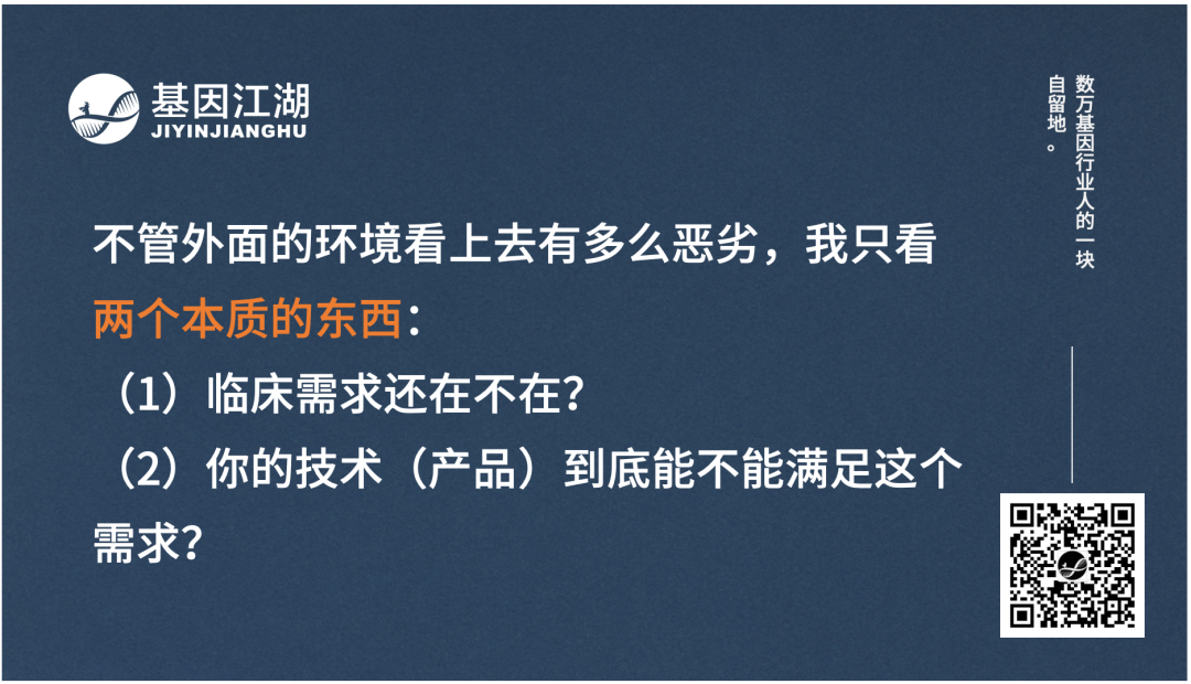 “不像一个纯粹的科学家,而对技术、产品、市场等,有很多突破常规的认识。”在公众号版主“陈在不在”的引荐和共同参与下,我们和思路迪熊磊博士进行了两个半小时的交流。我们问了很多,熊博讲了很多。讨论前,我给了一个题目 “肿瘤NGS十年迷失与出路”。临床NGS发展到今天,如大家所见,一定是出现了些问题。“问题在哪?如何解决?未来会怎样?”这是我想问的三大方向。这次非正式访谈,并不带有任何商业诉求,更不是马后炮式的分析来证明自己有多么高明。更多的只是一位行业老兵对于自己躬身入局的创业十余年、对于行业发展至今的体察、思考、洞见。访谈原始纪要5万字,摘录其中3000字。希望对大家理解这纷繁复杂、悲观与乐观交织的现在,有些许帮助。留言区支持任何建设性讨论。(下文多为受访者的即时记录,力求真实,即时表达不必求全责备。少部分内容做了不曲解原意的修改。)今天我们谈了很多融资环境、谈医疗反腐等政策对肿瘤NGS市场的冲击,行业悲观,从业者困惑。但不管外面的环境看上去有多么恶劣,我只看两个本质的东西:我觉得只要这两个问题的回答是yes,其他的环境的东西,那就是企业经营期间自然要面临的问题,都是可以解决的;但如果是这两个(本质的)东西出现了问题,你所说的临床需求并不存在,或你的技术(或产品)根本就不能解决你所提的需求,这才是行业最大的风险。除了这两点,我不认为其他东西是风险,其他东西在发展过程中,它总是曲折变化的,很正常。没有什么行业是一帆风顺的,我们但凡看到行业一帆风顺的,可能有两个原因,一、它下行期还没有到;二、我们对这个行业的发展历史了解比较少,它或许早已经历过下行的阶段。每一次行业环境的变化,都是企业发展的机会所在,变化越剧烈,企业面临的机会就越大。当然,从另外一个角度来说,挑战也就越大。“没有这4个要素的成熟,