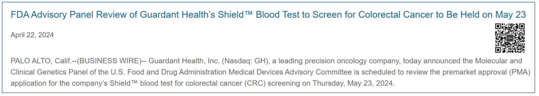 相关资料:1https://investors.guardanthealth.com/press-releases/press-releases/2024/FDA-Advisory-Panel-Review-of-Guardant-Healths-Shield-Blood-Test-to-Screen-for-Colorectal-Cancer-to-Be-Held-on-May-23/default.aspx