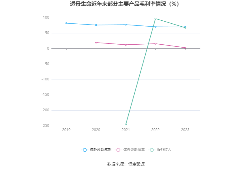 透景生命4月23日披露2023年年报。2023年,公司实现营业总收入5.43亿元,同比下降24.19%;归母净利润8940.35万元,同比下降28.34%;扣非净利润6370.40万元,同比下降37.11%;公司2023年年度利润分配预案为:拟向全体股东每10股派1.5元(含税)(约2462万元)。 数据统计显示,透景生命近三年营业总收入复合增长率为3.50%,在体外诊断行业已披露2023年数据的17家公司中排名第9。近三年净利润复合年增长率为-9.48%,排名11/17。 年报显示,公司主要从事自主品牌体外诊断产品的研发、生产与销售。 分产品来看,2023年公司主营业务中,体外诊断试剂收入5.00亿元,同比下降6.23%,占营业收入的92.19%;体外诊断仪器收入0.38亿元,同比下降78.75%,占营业收入的6.98%;服务收入收入0.04亿元,同比增长17.29%,占营业收入的0.81%。 截至2023年末,公司员工总数为574人,人均创收94.57万元,人均创利15.58万元,人均薪酬31.46万元,较上年同期分别变化-6.22%、-11.36%、39.86%。 2023年,公司毛利率为65.26%,同比上升8.22个百分点;净利率为15.60%,较上年同期下降1.68个百分点。从单季度指标来看,2023年第四季度公司毛利率为70.87%,同比上升10.16个百分点,环比上升1.61个百分点;净利率为31.56%,较上年同期上升13.31个百分点,较上一季度上升26.34个百分点。 分产品看,体外诊断试剂、体外诊断仪器、服务收入2023年毛利率分别为70.00%、3.02%、67.77%。 进一步统计发现,2023年公司自由现金流为3.05亿元,相比上年同期增长161.22%。 2023年,公司期间费用为2.80亿元,较上年同期减少1966.09万元;但期间费用率为51.63%,较上年同期上升9.74个百分点。其中,销售费用同比下降9.8%,管理费用同比下降15.5%,研发费用同比下降2.02%,财务费用由去年同期的-1123.54万元变为-446.14万元。 2023年全年,公司研发投入金额为7772.29万元,同比下降2.02%;研发投入占营业收入比例为14.32%,相比上年同期上升3.24个百分点。此外,公司全年研发投入资本化率为0。 |