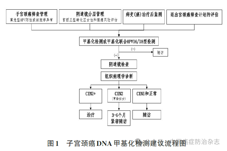 4.2.1 脱落细胞甲基化标志物用于女性生殖道肿瘤的临床诊断 女性生殖道内腔的通畅性让刷取宫颈脱落细胞进行无创分子检测子宫颈癌、子宫内膜癌成为可能。上海交通大学附属国际和平妇幼保健院团队对宫颈脱落细胞学检查的剩余样本进行PCDHGB7基因甲基化检测,PCDHGB7检测≥宫颈高级别鳞状上皮内瘤变的敏感性和特异性分别为82.1%和88.7%,检测宫颈癌的AUC为0.97。两项中国大型临床研究分别使用PCDHGB7甲基化和PAX1甲基化进行高危型HPV阳性女性的分层管理,诊断的敏感性分别为82.4%和76.9%,特异性分别为91.1%和91.6 %。国内外研究与专家建议,推荐子宫颈癌DNA甲基化筛检临床路径(图1):⑴HPV阳性高风险或细胞学异常女性的分层管理;⑵ 宫颈Ⅲ型转化区与潜在腺癌病人风险评估;⑶病变(癌)治疗后监测;(4)退出宫颈癌筛查计划的评估。