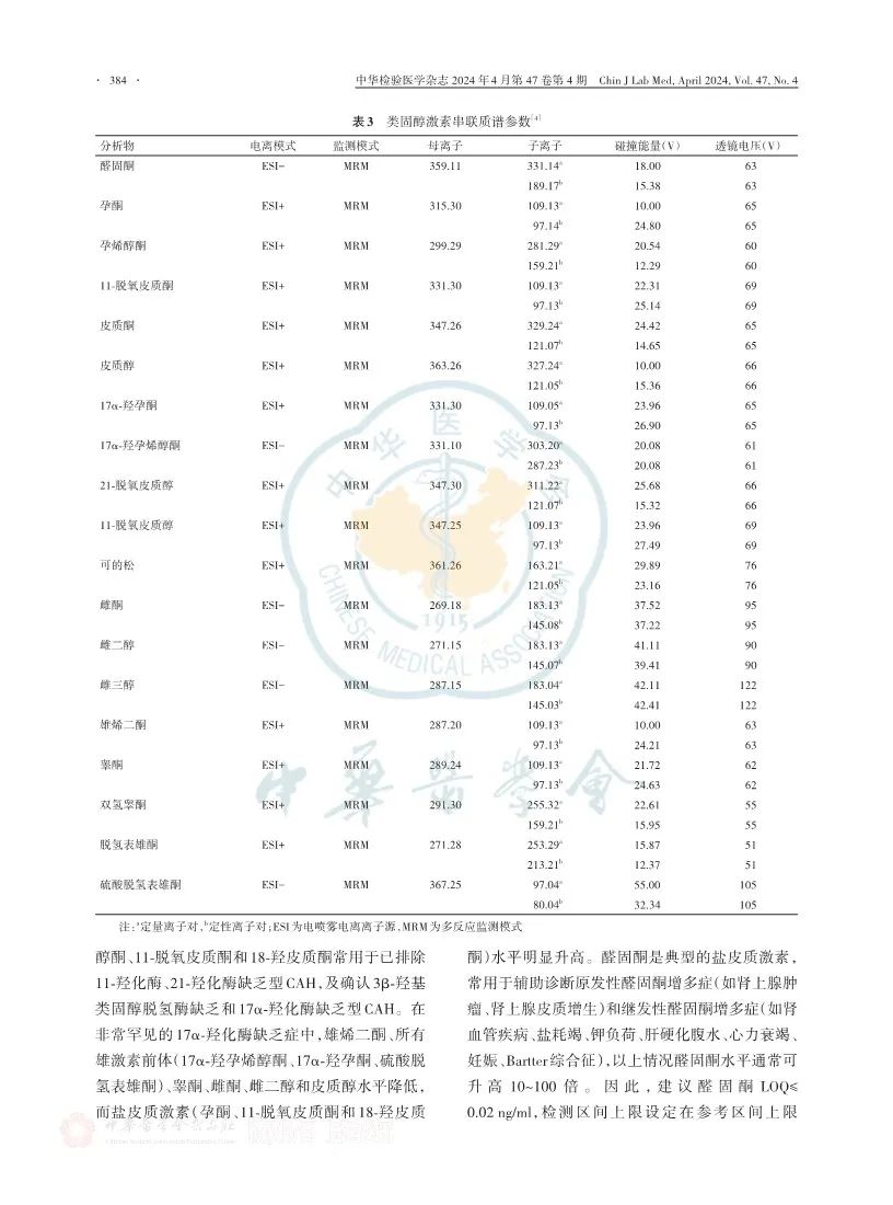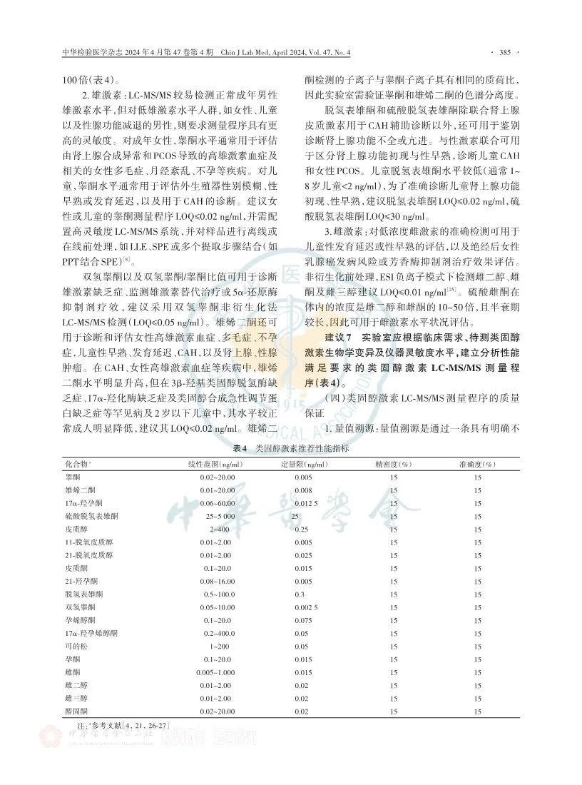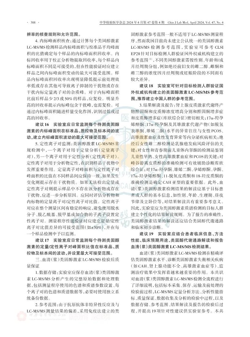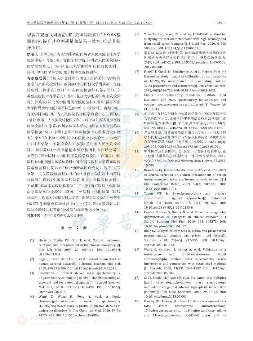 近日,中国质谱学会临床质谱专家委员会最新发布了《血清(浆)类固醇激素液相色谱串联质谱检测质量保证专家共识》,针对血清(浆)类固醇激素检测,涵盖了19个类固醇激素目标物,旨在确保检测结果的准确可靠性。 类固醇激素在血浆中的含量极低(pg含量),常规检测手段如生化免疫学往往很难精准检测,而且免疫学方法可检测的激素项目有限,且不同免疫平台的检测结果差异较大。遇到非特异性干扰时,检测结果可能给临床诊断带来困扰。而LC-MS/MS方法与传统方法相比具有更高的灵敏度和特异性,能够准确测定目标物的浓度,在激素检测中具有巨大优势,从而为临床诊断和治疗提供更可靠的依据。目前,质谱技术已经是激素类项目实验室检测公认的金标准。 但是开发一项质谱检测类固醇激素的完整方案是十分复杂的。该共识的发布将标准化检测过程,明确了样品处理、仪器校准、数据分析等关键步骤,从而为各个医学实验室提供了统一的操作指南。这不仅有助于提高检测的准确性和可靠性,也为医学研究和临床实践提供了更可靠的基础和质量保障。 附件: |