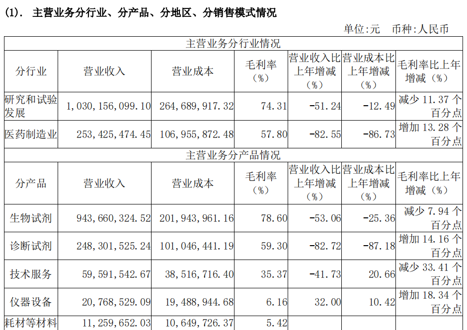4月27日,诺唯赞披露2023年年报,公司实现营业总收入12.86亿元,同比下降63.97%;归母净利润亏损7095.62万元,上年同期盈利5.94亿元;扣非净利润亏损1.93亿元,上年同期盈利5.97亿元;经营活动产生的现金流量净额为1.53亿元,同比下降79.19%。  分行业来看,诺唯赞的研究和试验发展业务收入达到10.3亿元,毛利率为74.31%,相比上年减少11.37%;医药制造专业营收2.53亿元,毛利率57.8%,增加13.28%。 分产品来看,生物试剂卖了9.43亿,同比减少-53.06%;毛利率78.60%,同比减少-25.36%,减少7.94%。诊断试剂营收2.48亿,同比减少-82.72%,毛利率59.30%,增加14.16%。技术服务的营收5959万,同比减少44.73%;毛利率35.37%,减少33.41个百分点。