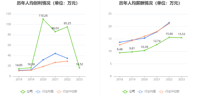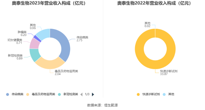 奥泰生物表示,2020年至2022年,公司经营业绩大幅增长主要来源于新冠检测产品销售相关业务的突发增长,未来公司的整体经营业绩与新冠疫情期间相比面临销售业绩大幅度下滑的风险。 分产品来看,2023年公司主营业务中,传染病类收入2.75亿元,占营业收入的36.48%;毒品及药物滥用类收入2.04亿元,占营业收入的27.00%;新冠检测类收入0.89亿元,占营业收入的11.80%。 以4月26日收盘价计算,奥泰生物目前市盈率(TTM)约为32.93倍,市净率(LF)约为1.55倍,市销率(TTM)约为7.88倍。 公司近年市盈率(TTM)、市净率(LF)、市销率(TTM)历史分位图如下所示: 数据统计显示,奥泰生物近三年营业总收入复合增长率为-12.73%,在体外诊断行业已披露2023年数据的29家公司中排名第23。近三年净利润复合年增长率为-35.70%,排名20/29。 截至2023年末,公司员工总数为1093人,2022年员工总数为1244人,减员151人,2023年人均创收69.05万元,人均创利16.52万元,人均薪酬15.53万元,较上年同期分别下降74.65%、82.66%、0.80%。 2023年,公司毛利率为48.78%,同比下降11.15个百分点;净利率为23.89%,较上年同期下降11.09个百分点。从单季度指标来看,2023年第四季度公司毛利率为51.28%,同比上升24.16个百分点,环比上升0.42个百分点;净利率为40.58%,较上年同期上升86.89个百分点,较上一季度上升22.90个百分点。 分产品看,传染病类、毒品及药物滥用类、新冠检测类2023年毛利率分别为45.35%、61.13%、54.81%。 报告期内,公司前五大客户合计销售金额1.46亿元,占总销售金额比例为19.38%,公司前五名供应商合计采购金额0.48亿元,占年度采购总额比例为29.24%。 数据显示,2023年公司加权平均净资产收益率为4.52%,较上年同期下降27.12个百分点。公司2023年投入资本回报率为3.68%,较上年同期下降26.89个百分点。 2023年,公司经营活动现金流净额为2476.37万元,同比下降98.18%;筹资活动现金流净额-5.59亿元,同比减少1.97亿元;投资活动现金流净额-1.41亿元,上年同期为-12.64亿元。 进一步统计发现,2023年公司自由现金流为-2.16亿元,上年同期为0.35亿元。 2023年,公司营业收入现金比为103.30%,净现比为13.71%。 营运能力方面,2023年,公司公司总资产周转率为0.17次,上年同期为0.78次(2022年行业平均值为0.60次,公司位居同行业13/38);固定资产周转率为3.02次,上年同期为19.41次(2022年行业平均值为5.40次,公司位居同行业4/38);公司应收账款周转率、存货周转率分别为6.30次、2.02次。 2023年,公司期间费用为1.99亿元,较上年同期减少1.66亿元;但期间费用率为26.30%,较上年同期上升15.54个百分点。其中,销售费用同比下降53.91%,管理费用同比下降14.7%,研发费用同比下降41.55%,财务费用由去年同期的-7092.70万元变为-5853.55万元。 资产重大变化方面,截至2023年年末,公司在建工程较上年末增加1054.30%,占公司总资产比重上升10.96个百分点;货币资金较上年末减少33.52%,占公司总资产比重下降10.20个百分点;交易性金融资产较上年末减少19.72%,占公司总资产比重下降3.29个百分点;其他流动资产较上年末增加536.78%,占公司总资产比重上升1.29个百分点。 负债重大变化方面,截至2023年年末,公司合同负债较上年末减少71.73%,占公司总资产比重下降2.13个百分点;应付账款较上年末减少54.66%,占公司总资产比重下降1.76个百分点;应交税费较上年末减少23.54%,占公司总资产比重下降0.29个百分点;其他流动负债较上年末减少98.58%,占公司总资产比重下降0.24个百分点。 从存货变动来看,截至2023年年末,公司存货账面价值为1.89亿元,占净资产的4.93%,较上年末减少506.51万元。其中,存货跌价准备为5357.36万元,计提比例为22.F。 2023年全年,公司研发投入金额为1.21亿元,同比下降41.55%;研发投入占营业收入比例为16.06%,相比上年同期上升9.94个百分点。 年报称,2023年度,公司新增授权专利/软件著作权共37项,其中发明专利1项,实用新型专利18项,外观设计专利16项,软件著作权2项。截至2023年底,公司累计获得授权专利/软件著作权158项,其中发明专利29项、实用新型专利65项、外观设计专利60项和软件著作权4项。 在偿债能力方面,公司2023年年末资产负债率为6.91%,相比上年末下降4.26个百分点;有息资产负债率为0.39%,相比上年末上升0.21个百分点。 2023年,公司流动比率为11.53,速动比率为10.84。 年报显示,2023年年末公司十大流通股东中,新进股东为上证红利交易型开放式指数证券投资基金、国泰致远优势混合型证券投资基金、招商银行(34.480, 0.08, 0.23%)股份有限公司-国泰价值优选灵活配置混合型证券投资基金(LOF)、香港中央结算有限公司,取代了三季度末的国泰佳泰价值平衡股票型养老金产品-中国建设银行(7.120, -0.12, -1.66%)股份有限公司、姜正金、宓莉、国泰医药健康股票型证券投资基金。在具体持股比例上,宁波文叶创业投资合伙企业(普通合伙)、国泰江源优势精选灵活配置混合型证券投资基金持股有所上升。 筹码集中度方面,截至2023年年末,公司股东总户数为5949户,较三季度末下降了1647户,降幅21.68%;户均持股市值由三季度末的64.39万元上升至91.42万元,增幅为41.98%。 指标注解: 市盈率=总市值/净利润。当公司亏损时市盈率为负,此时用市盈率估值没有实际意义,往往用市净率或市销率做参考。 市净率=总市值/净资产。市净率估值法多用于盈利波动较大而净资产相对稳定的公司。 市销率=总市值/营业收入。市销率估值法通常用于亏损或微利的成长型