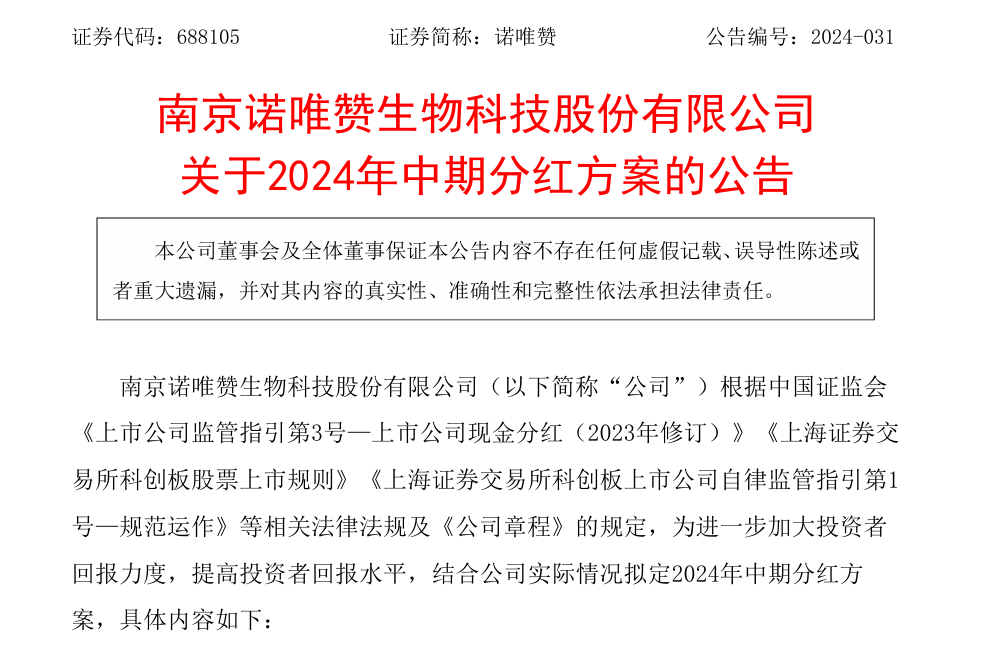 5月6日晚间,诺唯赞发布公告称,公司拟于2024年中期(包含半年度、前三季度),在当期盈利、累计未分配利润为正、公司现金流可以满足正常经营和持续发展需求,并且符合《公司章程》规定的其他利润分配条件的前提下,进行分红,现金分红总额不超过相应期间归属于公司股东的净利润。