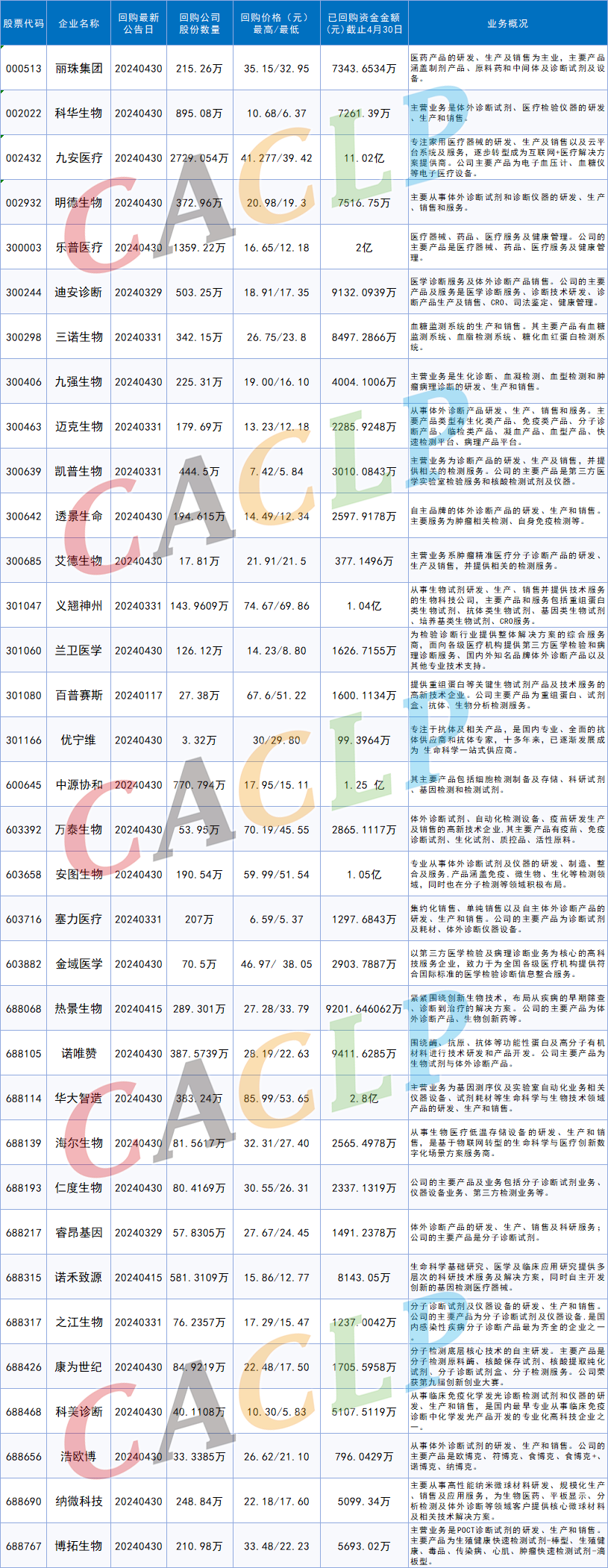 截止2024年5月7日,A股共有400余家公司发布股票回购相关公告,回购规模已近579亿元,这一数据已经超过去年全年的一半。根据CACLP统计,30余家体外诊断相关上市企业披露股票回购实施进展。回购方式包括定向回购和集中竞价交易,截止目前回购支付金额总计已超30亿元人民币。 从金额来看,回购股份支付金额超过1亿元的企业有:九安医疗、华大智造、乐普医疗、中源协和、安图生物、义翘神州,分别已支付11.02亿元、2.8亿元、2亿元、1.25亿元、1.05亿元、1.04亿元。从回购目的来看,九安医疗本次回购股份主要用于维护公司价值及股东权益和减少注册资本,安图生物本次回购股份全部用于减少公司注册资本,义翘神州本次回购股份用于注销并减少公司注册资本。华大智造、中源协和、乐普医疗回购股份将用于员工持股计划或股权激励。 回购股份支付金额在5000万-1亿元的企业有(按已支付金额高到低排序):诺唯赞、热景生物、迪安诊断、三诺生物、诺禾致源、明德生物、丽珠集团、科华生物、博拓生物、科美诊断、纳微科技等。其他回购股份的企业还包括:九强生物、凯普生物、金域医学、万泰生物、透景生命、海尔生物、仁度生物、迈克生物、康为世纪、兰卫医学、百普赛斯、睿昂基因、塞力医疗、之江生物、艾德生物、优宁维。 34家企业股份回购明细 按股票代码排序 |
