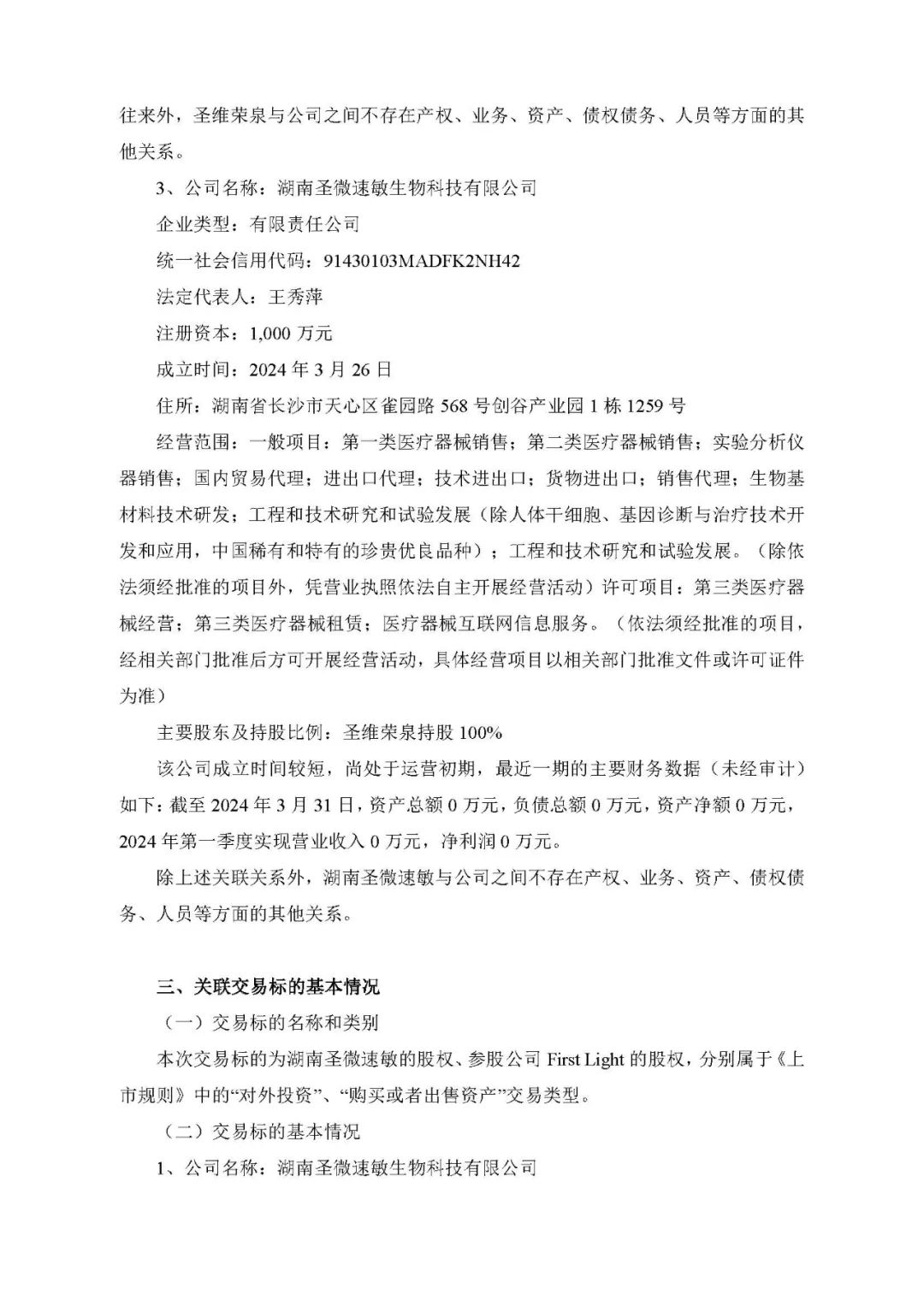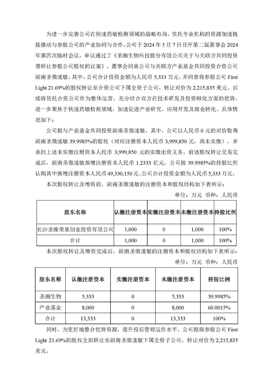 | 圣湘生物5月8日公告,公司拟与关联方湖南湘江圣湘生物产业基金合伙企业(有限合伙)共同投资合资公司湖南圣微速敏生物科技有限公司,其中,公司合计投资金额为5333万元。同时,公司拟将参股公司FirstLight 21.69%的股权转让至合资公司下属全资子公司,转让对价为221.58万美元。后续将依托合资公司作为整体运营,进一步聚焦于快速药敏检测领域,加速促进产业研究、应用开发及商业转化。