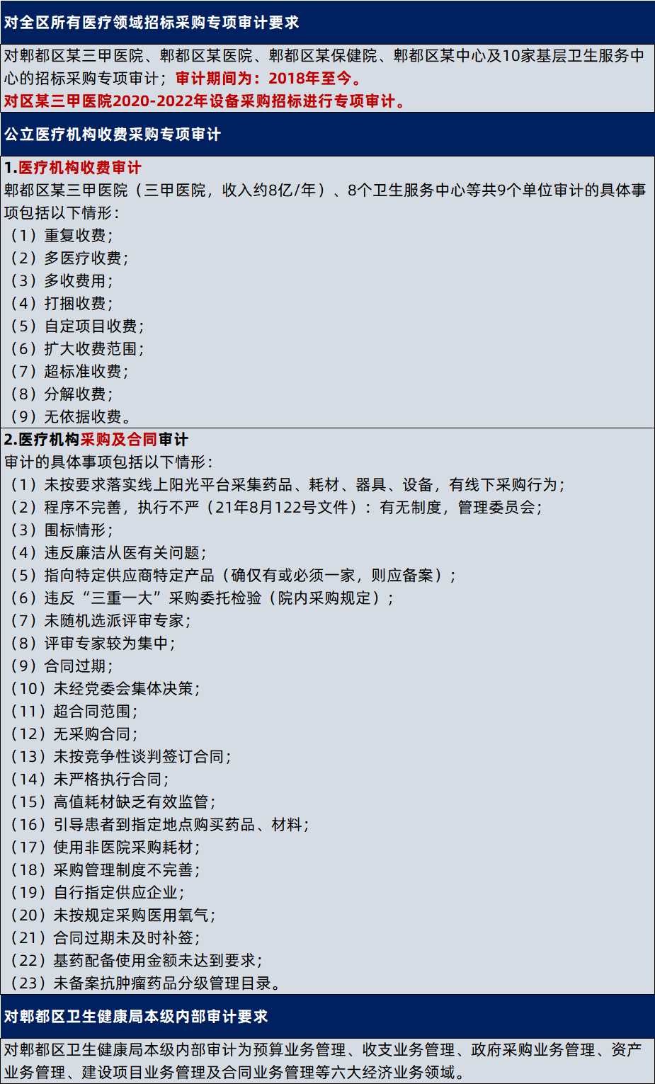 5月14日,国家审计署官网发布了题为《护航粮食稳产增收、关注医用耗材采购.....直击审计一线》的文章,医院耗材设备的采购正成为审计一线严查的重点。 南京市溧水区审计局在公立医疗机构运行情况审计中,重点关注医用耗材“零差价”。 由审计组深入医用耗材库房,现场核实医用耗材的“进、销、存”数据,了解医用耗材出入库价格是否一致、医用耗材采购和进出库程序手续是否规范、医用耗材存货是否存在超保质期、损坏、变质等情况。 不仅是南京市,近期以来,针对医院耗材、设备招标采购的监控和调查,已经开始在全国密集落地,且手段频频变异升级! 剑指院内耗材、设备采购, 审计局开启“穿透式”调查! 如4月24日,北京门头沟区审计局启动区属公立医疗机构医药采购管理情况专项审计,审计对象涵盖3个医药领域主管部门、4个区属公立医院及9个社区服务中心。 此次审计行动着力聚焦医疗药品、耗材、设备的采购管理情况,围绕“决策——采购——资金支付”这条主线开展“穿透式”调查,揭示公立医院在药品、耗材及设备采购管理中的突出问题,推动医疗服务规范化运行。 5月17日,泉州市鲤城区审计局面向全区所有公立医疗机构,开展收费及采购审计。 计划对7个街道社区卫生服务中心、1个区级妇幼保健院的医疗收费、药品耗材设备采购情况进行全面审计。并先行采集了8家医院的业务流水数据、采购明细、药品耗材出入数据、设备采购相关数据、财务数据进行关联分析,提前锁定疑点,盯住重点。 还有近日江苏阜宁县审计局展开县人民医院院长经济责任审计,重点关注医院耗材采购管理情况。审计人员聚焦采购计划制定、供应商筛选、招标采购过程以及合同签订等关键环节,现场查看医用耗材的种类、数量、有效期等信息,审查采购管理的合规性、准确性和有效性。 除了全面覆盖采购全过程和每一项细微数据,部分地方还引入了第三方专业机构参与审查,并将检查的时间跨度再次拉长,从六年前开始倒查! 第三方专业机构下场! 耗材招采倒查六年 不久前,成都市郫都区卫健局对“2024年度审计服务采购项目”进行招标,并在3月下旬由一家会计师事务所中标,预示着新一轮审查即将展开。 据采购公告,此次审计范围包括一家年收约8亿元的三甲医院,以及十余家基层医疗机构。重点领域包括医疗机构收费审计、采购及合同审计,以及全区所有医疗领域的招标采购专项审计。 上至大三甲医院医疗设备采购,下至基层医院的常规采购,均被纳入严查范围,且医疗设备采购将倒查三年,耗材等招标采购直接回溯至六年前! ▼成都市郫都区审计重点如下▼ (上下滑动查看) 无疑,官方及第三方机构等审计的力量正在逐步渗透至医药购销领域各个细枝末节,并将查账时间线一再拉长。 今年开年,全国审计工作会议在北京召开。会议强调:2024年要组织全国审计机关开展养老、医疗、义务教育等民生审计,严肃查处群众身边的“蝇贪蚁腐”,努力把审计监督跟进到民生保障的“最后一公里”。 国家及地方层面对医疗领域审计工作的重视,将2024推到“公立医院审计大年”的位置上。接下来,一场场深入院内耗材、设备采购及使用场景的严查,将在全国范围内揪出无数条隐蔽的医药腐败利益链。 |