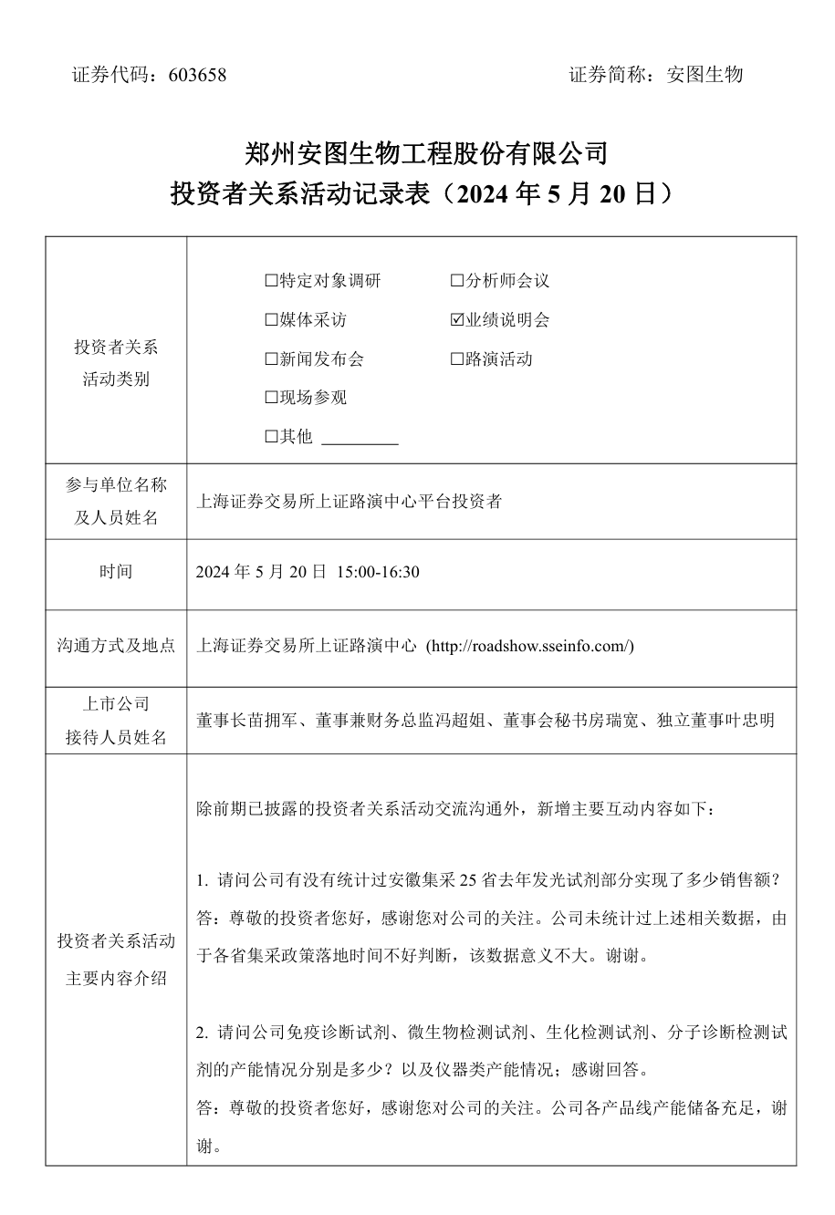 5月20日,郑州安图生物工程股份有限公司通过上海证券交易所上证路演中心平台举行业绩说明会,董事长苗拥军、董事兼财务总监冯超姐、董事会秘书房瑞宽和独立董事叶忠明接待了投资者,并进行了交流。 主要互动问题