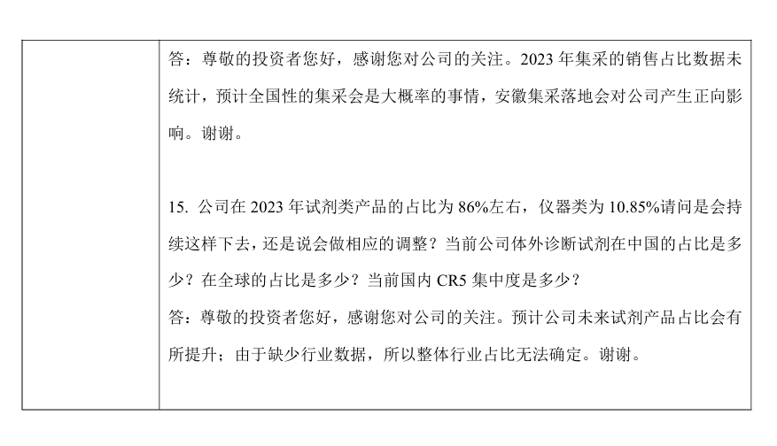 试剂类产品贡献了安图生物超八成营收,其毛利率也在增加。在今日举行的业绩说明会中,公司财务总监冯超姐直言,未来试剂产品占比会有所提升。 此外,公司董事长苗拥军对分子、微生物等板块业务增速做出了预测,而随着集采逐渐成为行业发展趋势,公司董秘房瑞宽认为,全国性的集采会是大概率的事,安徽集采落地对公司有正向影响。其次,相关仪器销量和海外拓展计划也是投资者所关注的话题。 据悉,安图生物主要从事体外诊断试剂和仪器的研发、制造、整合及服务,产品包括免疫、微生物、生化、分子、凝血等检测领域。针对仪器和试剂产能的问题,冯超姐回应称,公司各产品线产能储备充足,此外并未做更详细的说明。 年报显示,2023年,公司试剂类产品营收为38.15亿元,同比增加8.06%,毛利率同比增加4.36个百分点;仪器类产品营收为4.82亿元,同比下降32.99%,毛利率同比减少3.18个百分点。 从细分领域看,体外诊断按照检测方法分类主要包含免疫诊断、生化诊断、微生物、分子诊断、血液学诊断、POCT 等几大方面。苗拥军表示,公司微生物、生化、分子等板块的市场占比相较化学发光板块低很多。生化板块本身国产化程度较高,新增市场空间较小;微生物的增速在今年会有所提升;分子产线目前增速很好,对公司整体增速影响较小,但未来可期。 近年来体外诊断领域的带量集采、阳光采购、DRG等医改政策陆续落地,体外诊断试剂集采成为行业重要的发展趋势。今日国家医疗保障局办公室下发关于加强区域协同,做好2024年医药集中采购提质扩面的通知,称将聚焦重点领域,积极推进2024年集采扩面,深入推进高值医用耗材集中采购,在国家医保局重点指导的全国联采工作中提到了安徽牵头开展肿瘤标志物等体外诊断试剂联盟采购。 2023年12月8日,安徽省牵头的25省体外诊断联盟集采结果公布,据安徽省医保局统计,本次集采企业报价平均降幅为53.9%,预计年节省采购金额近60亿元。其中传染病八项(化学发光法)最高降幅65.2%,最低降幅50.01%,平均降幅54.14%。其中,雅培、罗氏等进口企业以及迈瑞、安图、新产业等国内龙头企业均以高于50%的降幅全部拟中选。 房瑞宽表示,2023年集采的销售占比数据未统计,预计全国性的集采会是大概率的事情,安徽集采落地会对公司产生正向影响。此外,其补充说明,集采实施后,相对于原有的销售价格会有一定程度的下降,但在销售量上应该实现更多的增长。 而在仪器领域,年报显示,2023年公司仪器类产品销售量为2114台,全自动磁微粒化学发光免疫检测系统多款仪器中,目前A2000Plus、A1000、A1000S、A6000已获医疗器械注册证,据苗拥军透露,2023年度,公司A6000装机约400台,A2000装机约800台。此外,今年一季度A6000的装机数量为150多台,年度装机目标为700台。 在海外拓展计划方面,安图生物方面在回答投资者提问时表示,公司正加快国际市场拓展步伐,推动产品市场准入、营销及服务本土化等方面工作,已有在部分国家或地区建立海外子公司的相关规划,未来海外业务占比会逐步提升。 公告原文 |