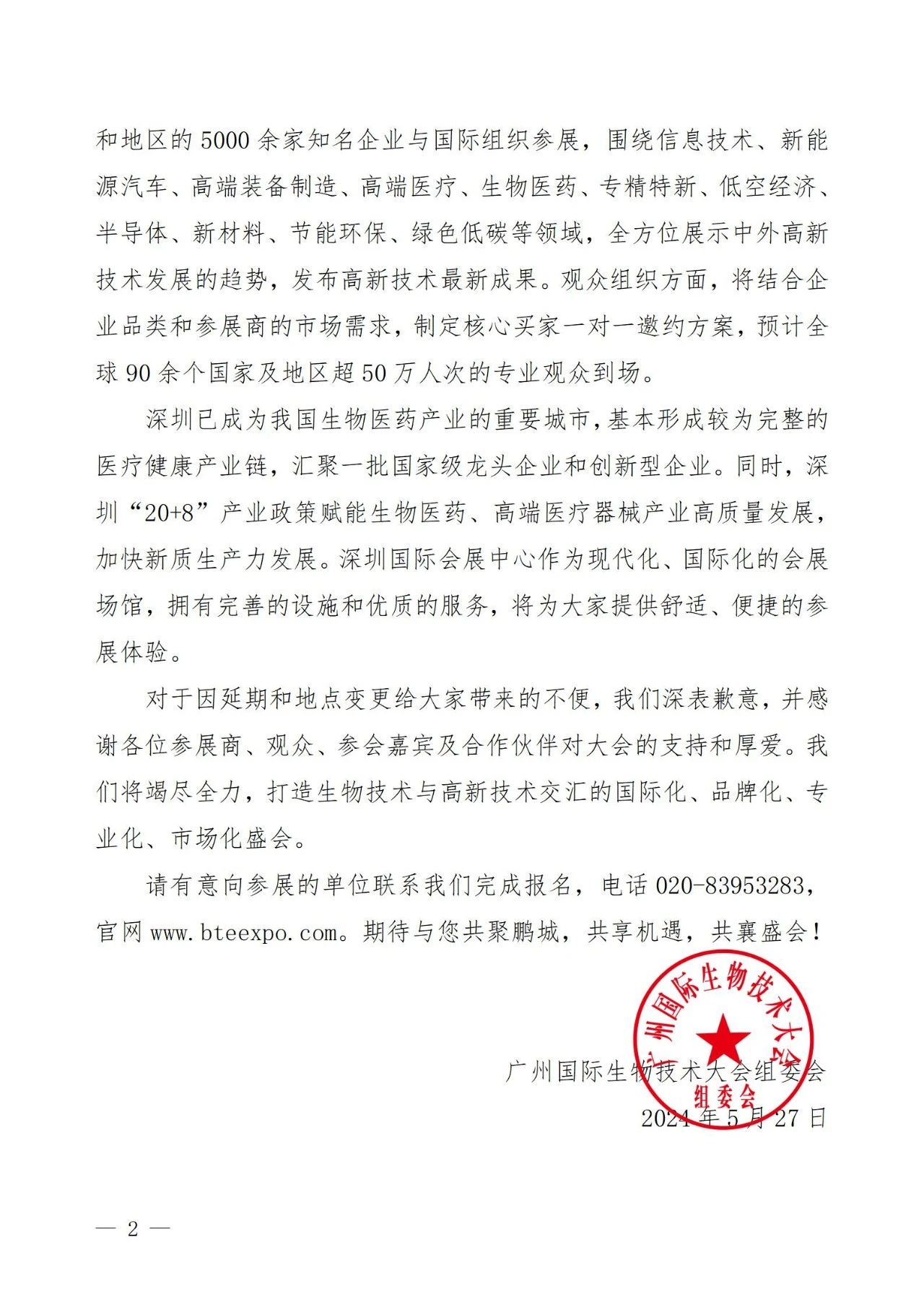 | BTE国际生物技术大会暨展览会融入第二十六届高交会,作为展示专区; | | 时间地点变更为:2024年11月14—16日在深圳国际会展中心举办。 |