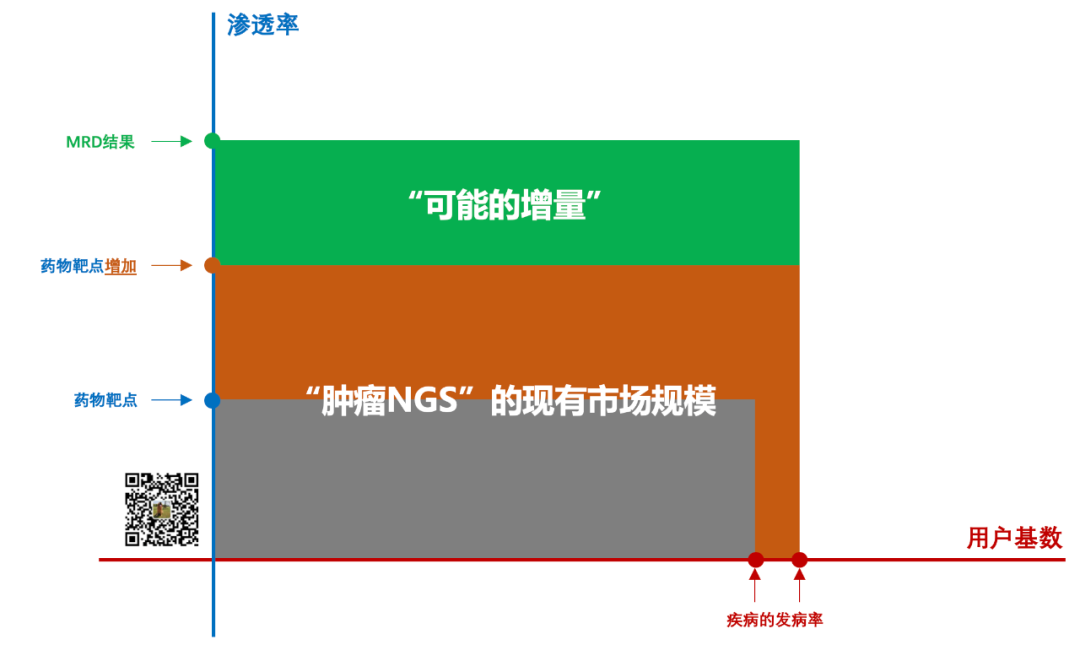 其价值在于去指导药物的“选择”,比如我们耳熟能详的伴随诊断。 它的检测市场规模也是一个横纵轴的合围面积: 其中横轴的“用户基数”与疾病的发病率挂钩,而纵轴的“渗透率”则由药物选择的复杂度来决定。 在过去的超过10年时间里,肿瘤NGS行业的核心业务都是伴随诊断——也就是“药敏”。 既往的所有产品迭代,不管大panel、小panel、组织检测、血液检测,都是在这一个固定的蛋糕中去切分。 这种“高度集中”的业务,最大的危机在于: 不管是横轴还是纵轴,主动权都不在肿瘤NGS公司手上。 大家吃的都是药物发展的红利。 而红利,总有吃完的那一天。 02 “消退的红利” 在上一篇文章( 祛魅的肿瘤NGS:谁让“内卷”变成了“内耗”)发出后,有朋友问我怎么就不能是第三种情况:大家一起做大做强再创辉煌。 我说我也想,而且这其实也不难实现: 只要市场整体能保持高速增长,那么一切的内部矛盾就不过是小插曲而已。 但很可惜,这个真没有。 回到上面那张图。 在过去的20年中,药物选择的复杂度是由“药物靶点”驱动的。 ——非小细胞肺癌无疑是中间最具有代表性的典型,从一个EGFR扩展到如今的近十个靶点。 但同样以NSCLC为例: 我们有多久没有看到新的靶点出现了? 是了,那个埋着的雷终于炸了 ——随着药物在新靶点的突破上遇到瓶颈,肿瘤NGS的检测市场规模增长停滞了。 MRD,就是诞生在这样一个行业背景下。 03 “新质生产力” MRD自一诞生,就承载着着“成为全村希望”的期冀。 而要想成为全村的希望,就得拿出硬货 ——停留在“没你也行、有你也可”的“动态监控”是没前途的。