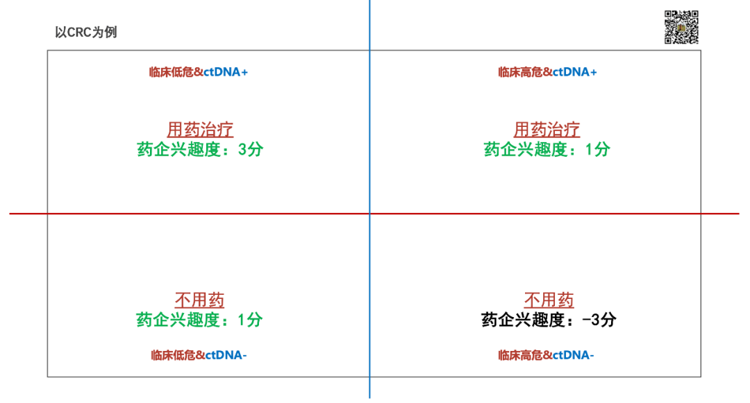 MRD,最终也必然要变成一个“药敏”检测。 也就是我们之前反复提到的:回答四象限。 如果仔细咂摸这四象限,尤其是左上和右下,相信大家都能很快反应过来它和伴随诊断的差异。 MRD并不是在原有的检测市场规模中去“切蛋糕”,而是通过延长纵轴去做了一个新增市场。 更可贵的是,增加的这部分纵轴,其驱动因素不是药物靶点。 MRD自身,就是延长纵轴的那个驱动因素(糖妹提醒:不一定是药,也可是化/放疗)。 ——主动权,第一次掌握在了肿瘤NGS行业自己手上。 04 “团结就是力量” “众人拾柴火焰高” MRD的纵轴能做的多高,也取决于有多少伙伴在支持。 在一个“药敏”检测的市场中,除了检测公司本身,还有三方:医生、患者、药企。 这中间,“药企”是非常重要的力量。 在MRD四象限中,如果要给药企的意愿度做一个排名: