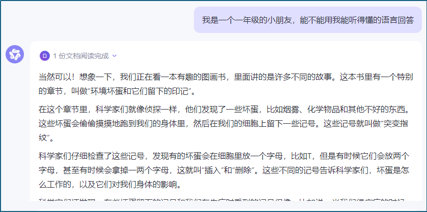 回到翻译板块我们举例的那篇文献,非常的专业,如果我们看的不是很明白,或者想向一位一年级的小朋友介绍这方面的知识,就可以告诉AI“我是一名一年级的小朋友,能不能用我能听得懂的语言回答”,这时的回答就会非常的生动,便于理解。