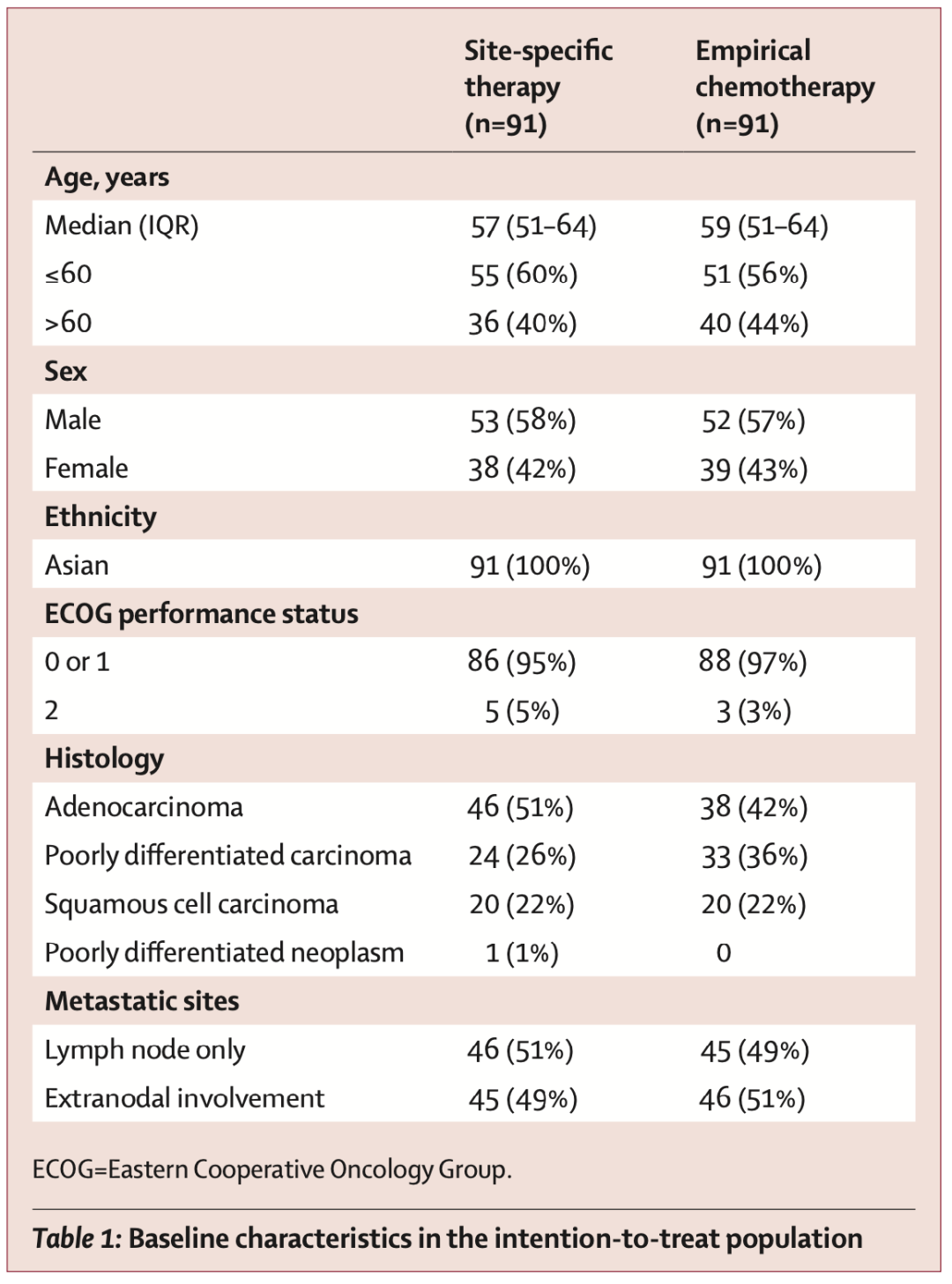 2017年9月18日至2021年3月18日期间,来自复旦大学附属肿瘤医院的共182名患者被纳入研究并随机分配至部位特异性治疗组(N=91)或经验性化疗组(N=91)。在182名患者中,男性患者(N=105,58%)多于女性患者(N=77,42%);96%的患者ECOG体能状态评分为0-1;50%的患者仅出现淋巴结转移。(表1)