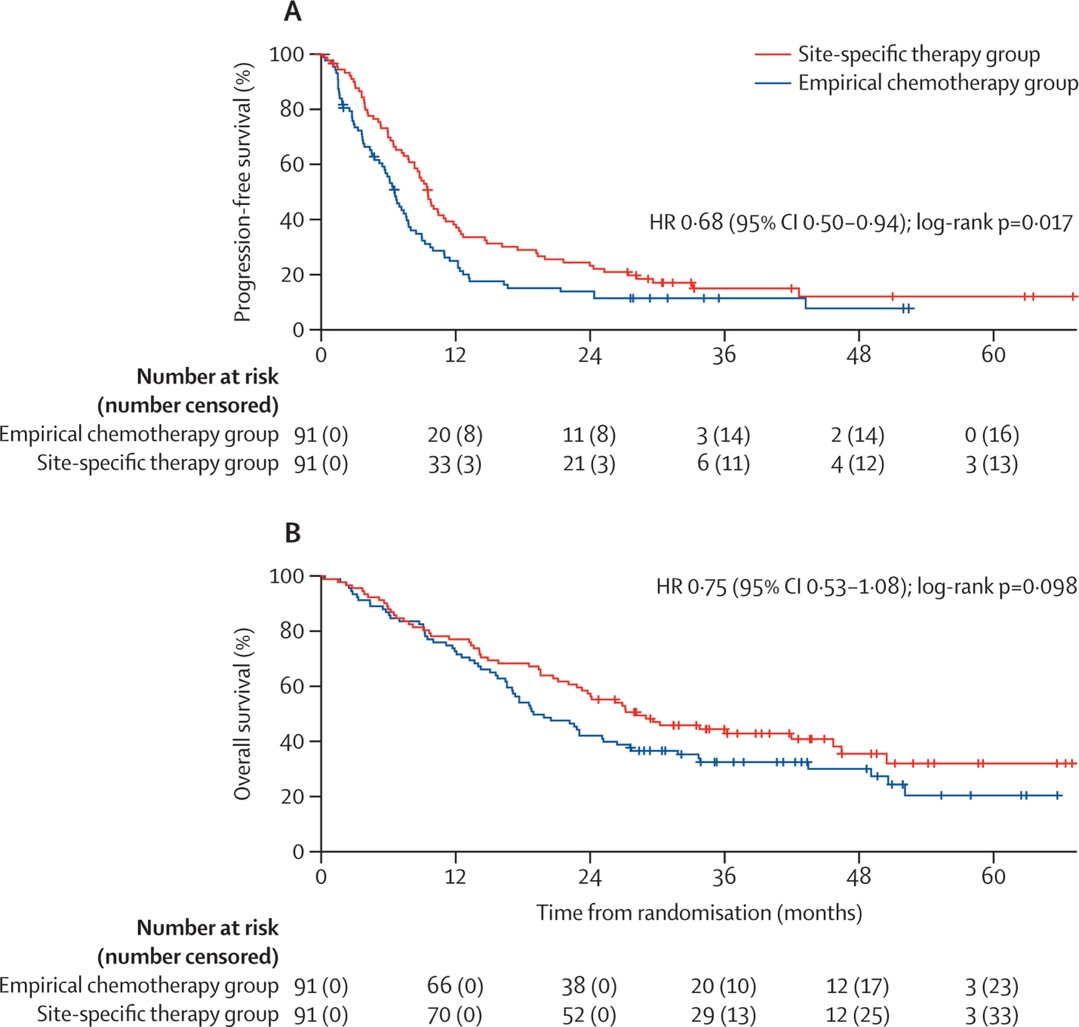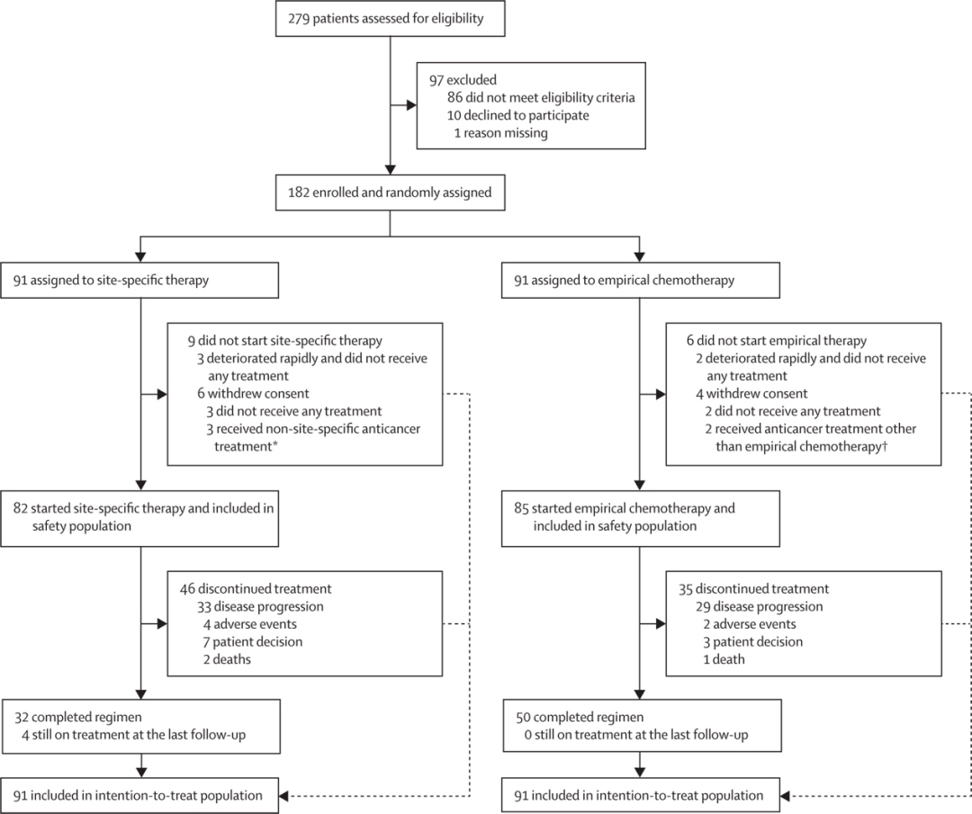 入组的患者按照Pocock和Simon最小化法随机分配(1:1)至部位特异性治疗组或经验性化疗组。最小化随机因素为ECOG体力状况评分和疾病累及范围(局限于淋巴结转移或者有淋巴结外转移),两者权重相等。临床医生和患者均知晓干预措施和治疗方案。部位特异性治疗组的患者采用90基因检测分析肿瘤的组织起源,并根据组织起源进行部位特异性治疗。经验性化疗组的患者接受经验性化疗方案:紫杉醇(第1天静脉注射175mg/m2)联合铂类药物,或吉西他滨(第1天和第8天静脉注射1000mg/m2)联合铂类药物(顺铂第1天静脉注射75mg/m2或卡铂曲线下面积5mg/mL/min)。