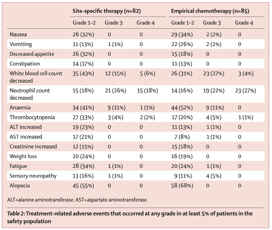 安全性分析中,部位特异性治疗组(N=82)和经验性化疗组(N=85)中最常出现的≥3级治疗相关不良事件为中性粒细胞减少(36[44%] vs. 42[49%])、白细胞减少(17[21%] vs. 26[31%])和贫血(10[12%] vs. 9[11%])。部位特异性治疗组和经验性化疗组中分别有56%(46/82)和61%(52/85)的患者出现≥3级的治疗相关不良事件,两组均未观察到治疗相关死亡。
