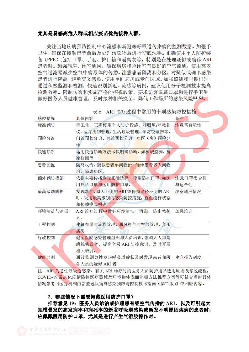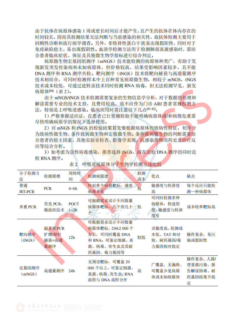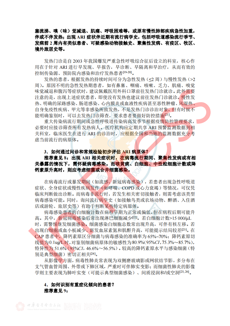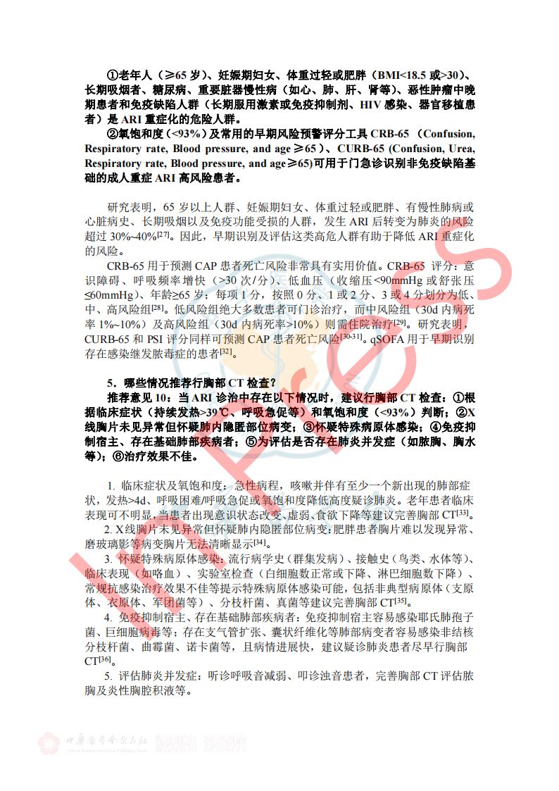 2024年7月26日《成人门急诊急性呼吸道感染诊治与防控专家共识》于中华传染病杂志42卷在线发表,本共识由全球华人临床微生物暨感染学会邀请我国感染、呼吸、临床微生物学和医院感染管理等领域的专家,结合国内、外的相关文献,共同编写和制定,针对急性呼吸道感染的病原学、流行病学、临床及影像学特征、病原检测方法、治疗、预防与控制等方面,基于循证证据,总结出23条建议,供临床参考借鉴,以提高医生对疾病的认识,优化诊治及感控策略和门诊就诊流程。(原文见文末) 急性呼吸道感染(Acute respiratory infection,ARI)指各种病原体引起任何呼吸道症状急性发作的临床急性病(通常病程不超过21天),主要症状包括咳嗽、咳痰、呼吸急促、咽喉痛、流涕 。ARI主要包括急性上呼吸道感染、急性支气管炎和社区获得性肺炎(community-acquired pneumonia,CAP),常见致病微生物为病毒和细菌(含不典型病原体)。 一、ARI的流行病学 1.不同季节我们应关注哪些ARI病原体? 推荐意见1:冬春季应重点关注流感病毒、鼻病毒、人偏肺病毒、呼吸道合胞病毒;COVID-19 尚未形成明显季节流行规律,全年均可发生,以寒冷的冬季较为多见;腺病毒感染通常没有季节性,但在人员群聚场所、日托中心和医院病房中应予以关注;嗜肺军团菌常见于夏末秋初,其他细菌真菌感染通常无明显季节性。 2.近年来我国急性LRI常见病原体有哪些? 推荐意见2:急性下呼吸道感染(lower respiratory infection,LRI)包括急性气管、支气管炎和肺炎;急性气管、支气管炎通常由病毒所致,我国成人CAP最常见的病原体是肺炎链球菌和肺炎支原体,约1/3肺炎支原体感染存在混合感染(病毒或细菌);老年患者中肺炎克雷伯菌、铜绿假单胞菌和金黄色葡萄球菌相对多见;在重症CAP患者中流感病毒、肺炎链球菌、肠杆菌目细菌及嗜肺军团菌多见,且合并感染较多。 4.哪些细菌性ARI可在人际间传播或引起聚集性发病? 推荐意见4:应警惕肺炎支原体、百日咳鲍特菌、溶血性链球菌(猩红热)在人际间传播或引起聚集性感染。目前无证据表明军团菌、肺炎链球菌可造成人际间传播。 5.需警惕哪些跨物种传播的ARI病原体? 推荐意见5:接诊ARI患者时应关注跨物种传播疾病如禽流感、鹦鹉热等,注意询问动物接触史(尤其是禽类、野生动物)、旅行史(尤其野外环境)。一旦发现疑似跨物种传播的ARI,应立即采取检查措施明确病原体并及时上报相关部门。 二、ARI的临床及影像学特征 1.哪些常见临床表现应考虑ARI? 推荐意见6:若出现流涕、鼻塞、打喷嚏和咽痒等较轻的症状,伴或不伴发热,应疑似急性上呼吸道感染。若出现发热、咳嗽、咳痰、呼吸急促到严重的脓毒症和呼吸窘迫等,应疑似急性下呼吸道感染。 表1 ARI常见的临床表现 3.如何通过问诊和常规检验初步评估ARI病原体? 推荐意见8:出现ARI相关症状时,在病毒流行期间、聚集性发病或有相关暴露的情况下,需怀疑病毒感染。而咳黄痰、白细胞、中性粒细胞计数或降钙素原升高时,则应考虑细菌或合并细菌感染。 4.如何识别有重症化倾向的患者? 推荐意见9: ①老年人(≥65岁)、妊娠期妇女、体重过轻或肥胖(BMI<18.5或>30)、长期吸烟者、糖尿病、重要脏器慢性病(如心、肺、肝、肾等)、恶性肿瘤中晚期患者和免疫缺陷人群(长期服用激素或免疫抑制剂、HIV感染、器官移植患者)是ARI重症化的危险人群。 ②氧饱和度(<93%)及常用的早期风险预警评分工具CRB-65 (Confusion, Respiratory rate, Blood pressure, and age≥65)、CURB-65 (Confusion, Urea, Respiratory rate, Blood pressure, and age≥65)可用于门急诊识别非免疫缺陷基础的成人重症ARI高风险患者。 三、ARI病原体检测方法 1.哪些ARI患者需要行病原学检查? 推荐意见11:重症患者、重症高危人群(如老年人、儿童、孕产妇、免疫缺陷人群和有基础疾病人群)感染者、常规治疗无效者、怀疑特殊病原体感染者、有特定病原体流行病学暴露史以及社区或医疗机构内出现的聚集性呼吸道感染患者需进行病原学检查。 2.如何选择病原学检测方法? 推荐意见12:如果在呼吸道病原体流行期间,尤其是病毒感染时,建议尽可能在起病早期采用基于核酸技术的检测方法;如果怀疑合并细菌或真菌感染,应结合传统病原学检测(含涂片染色镜检和分离培养)、血清学检测(抗原/抗体检测)等方法加以鉴别。对于重症感染、可疑特殊病原体感染、免疫缺陷人群或聚集性感染的患者在完善常规检测的同时可选择mNGS/tNGS (Metagenomic Next-Generation Sequencing/Targeted Next-Generation Sequencing)检测。