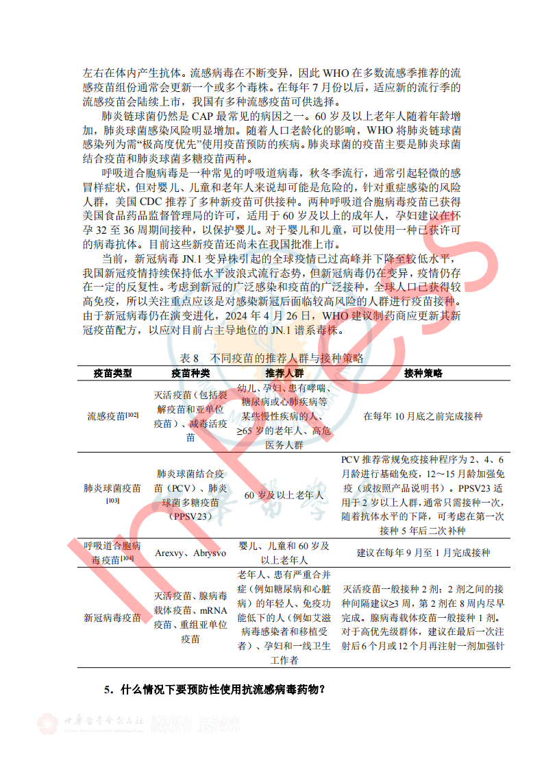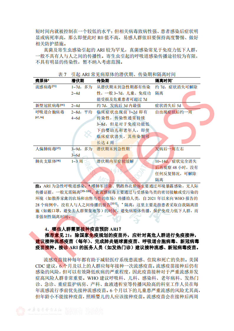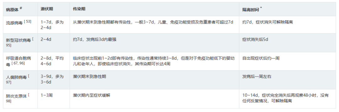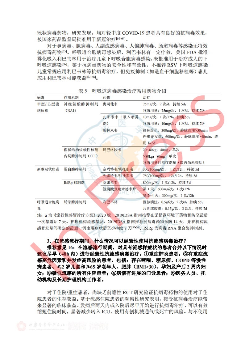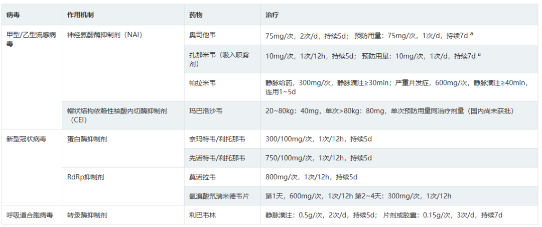 表2呼吸道病原体分子生物学检测方法比较 3.如何选择病原学检测样本类型? 推荐意见13: ①拟诊急性上呼吸道感染时推荐采集鼻咽拭子或口咽拭子; ②拟诊CAP推荐采集深部痰液标本,怀疑细菌性肺炎可同时采集血液标本; ③病情危重或怀疑特殊病原体感染时应同时采集BALF; ④如果患者有胸腔积液应采集胸水标本。 表3 ARI常见病原体检测标本选择和检测项目 四、ARI治疗策略 1.ARI的抗菌药物治疗策略? 推荐意见14: (1)急性上呼吸道感染和急性支气管炎,主要为病毒感染,不建议常规抗菌药物治疗。化脓性扁桃体炎或脓肿,可选用青霉素类、一代或二代头孢菌素。 (2)门诊治疗的 轻中症CAP患者, 根据年龄、基础疾病、有无耐药菌风险等,口服或静脉用抗菌药物,包括 阿莫西林、阿莫西林/克拉维酸、头孢菌素联合大环内酯类或多西(米诺)环素,也可呼吸喹诺酮类单药。 2.常用病毒性ARI的药物及方案选择? 推荐意见15: ①建议确诊流感病毒感染患者早期(48h内)进行抗病毒治疗,神经氨酸酶抑制剂和病毒RNA聚合酶抑制剂对目前流行的甲型和乙型流感病毒具有良好的效果和安全性,根据患者情况选择合适抗病毒药物。 ②建议确诊新型冠状病毒感染患者早期进行抗病毒治疗,药物可选择先诺特韦/利托那韦、奈玛特韦/利托那韦、氢溴酸氘瑞米德韦、莫诺拉韦、来瑞特韦,结合患者病情选择合适的抗病毒治疗药物。 ③除了新型冠状病毒和流行性感冒病毒,对于非高危人群的呼吸道病毒感染,不建议常规予以抗病毒药物;但对于高危人群常见的呼吸道合胞病毒感染,可尝试予以利巴韦林抗病毒药物治疗。 表5呼吸道病毒感染治疗常用药物介绍 五、ARI预防与控制 3.如何判断ARI病原体的传播能力? 推荐意见20:引起ARI的病毒通常较细菌具有更强的传播能力,症状较重的患者传染性更强,发病初期病原体致病性较强,传染性也最强。多种ARI病原体在发病前就已经具备了传染性,因此临床诊治中需询问流行病学史,如患者家庭聚集及发病情况等,及时给予防治建议。 表7 引起ARI常见病原体的潜伏期、传染期和隔离时间 小结 急性呼吸道感染在临床中极为常见,通常病情较轻、预后良好,但重症患者的住院率和病死率会显著升高。因此,早期识别重症感染、及时诊治及早期预防,具有重要临床价值及意义。 需进行病原学检查患者群体