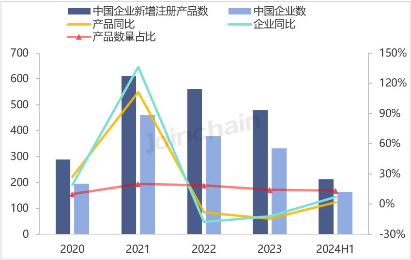 一 总体情况 | 1、商品类别 据众成数科(JOINCHAIN)统计,2024年上半年美国境内的医疗器械新增产品注册数量达1618件,同比增长4.93%。共涉及59个国家/地区的1138家企业(医疗器械制造商)。其中,中国境内有164家企业在美国获得212件医疗器械产品注册证,占美国医疗器械产品新注册总数的13.10%,产品新增注册数量较去年同期下降了4.07%。 图 1 2020-2024H1美国医疗器械产品注册证情况 图 2 2020年-2024H1中国企业获得美国医疗器械产品注册证情况 | 2、商品类别 据众成数科(JOINCHAIN)统计,2024年上半年澳大利亚境内的医疗器械新增产品注册数量达2033件,同比下降2.40%。共涉及52个国家的1023家企业(医疗器械制造商)。其中,中国境内有254家企业在澳大利亚获得427件医疗器械产品注册证,占澳大利亚医疗器械产品新注册总数的21.00%,产品数量同比增长21.31%。 图 3 2020-2024H1澳大利亚医疗器械产品注册证情况 图 4 2020-2024H1中国企业获得澳大利亚医疗器械产品注册证情况 二 区域分析 | 1、美国 据众成数科(JOINCHAIN)统计,在2024年上半年获得美国境内医疗器械产品注册证的国家中,美国以763件产品位居榜首,占比47.16%,涉及企业507家;中国(不含香港、澳门、台湾)排在第二,产品数量为212件,占比13.10%,涉及企业164家;排名第三的是韩国,新注册产品数量为62件,占比3.83%,涉及49家企业。 图 5 2024H1美国新增注册产品国家分布情况(Top10) 从企业省份分布来看,广东省企业获得的产品数量最多,为81件,占比38.21%,涉及企业59家;排名第二三位分别是江苏省和浙江省,产品数量分别为30件、20件,占比分别为14.15%、9.43%,涉及企业数分别有25家、17家。 表1 2024H1美国新增注册产品中国企业省份分布情况 | 2、澳大利亚 据众成数科(JOINCHAIN)统计,在2024年上半年获得澳大利亚境内医疗器械产品注册证的国家中,美国以458件产品位居榜首,占比22.53%,涉及企业174家;中国(不含香港、澳门、台湾)排在第二,产品数量为427件,占比21.00%,涉及企业254家;排名第三的是德国,新注册产品数量为272件,占比13.38%,涉及120家企业;澳大利亚排在第四位。 图 6 2024H1澳大利亚新增注册产品国家分布情况(Top10) 从企业省份分布来看,广东省企业获得的产品数量最多,为139件,占比32.55%,涉及企业78家;排名第二三位分别是江苏省和浙江省,产品数量分别为82件、78件,占比分别为19.20%、18.27%,涉及企业数分别有40家、42家。 表2 2024H1澳大利亚新增注册产品中国企业省份分布情况 三 企业榜单 | 1、美国 据众成数科(JOINCHAIN)统计,在2024年上半年获得美国境内医疗器械产品注册证的中国企业中,排名靠前的分别有上海联影医疗科技股份有限公司、深圳市理邦精密仪器股份有限公司和深圳由莱智能电子有限公司。 图 7 2024H1美国新增注册产品中国企业榜单(Top10) | 2、澳大利亚 据众成数科(JOINCHAIN)统计,在2024年上半年获得澳大利亚境内医疗器械产品注册证的中国企业中,世源科技(嘉兴)医疗电子有限公司的产品注册数位居首位,产品数量为20件;其次是常州同创医疗器械科技有限公司,产品数量为10件;广州维力医疗器械股份有限公司和浙江大宇医药有限公司尖山医药商店并列第三,产品数量均为9件。 图 7 2024H1澳大利亚新增注册产品中国企业榜单(Top10) 数据来源:MDCLOUD(医械数据云) 统计时间范围:2024年1-6月 统计维度:注册时间、注册数量、产品分类、制造商名称、制造商国家、制造商省份等。 |