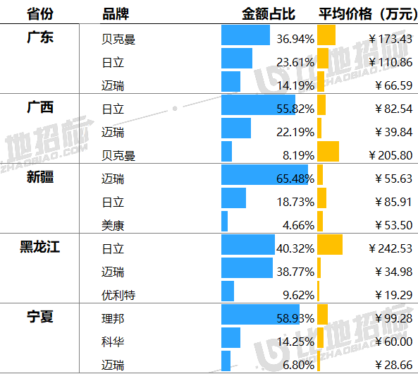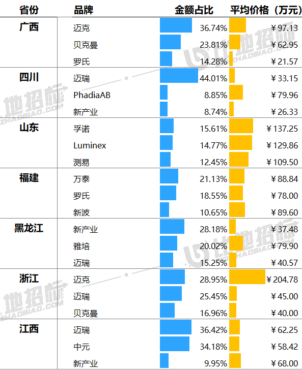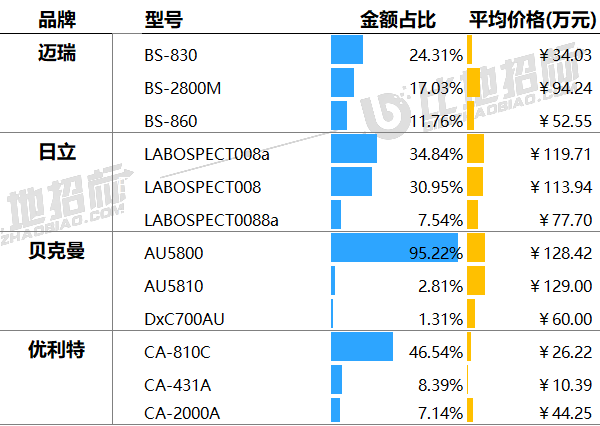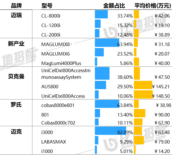 化学发光免疫分析仪 据比地招标网统计:2024年1-6月化学发光免疫分析仪设备招投标市场有888家采购单位,909家中标单位,中标设备数量达1244台,中标总金额约3.77亿元。 设备品牌方面,金额市占率较高的品牌有迈瑞、新产业、贝克曼、罗氏、迈克,市占分别为18.06%、8.73%、8.36%。前3品牌合计占比达35%,具有一定的品牌集中度。 数据来源:比地招标网 数据来源:比地招标网 数据来源:比地招标网 主要供应商及对应中标品牌包括:广西倍华康医疗设备有限公司(贝克曼),杭州秒识科技有限公司(迈瑞),四川奥为生物技术有限公司(新产业)等。 TOP3品牌型号供应商中标金额占比 数据来源:比地招标网 生化分析仪 2024年1-6月,生化分析仪设备招投标市场有1100家采购单位,1039家中标单位,中标设备数量达1470台,中标总金额约7.45亿元。 设备品牌方面,金额市占率较高的品牌有迈瑞、日立、贝克曼,市占分别为34.95%、19.17%、15.08%。前3品牌合计占比达69%,品牌集中度较高。 数据来源:比地招标网 数据来源:比地招标网 数据来源:比地招标网 主要供应商及对应中标品牌包括:广西锴特医疗科技有限公司(日立),国药集团中科器深圳有限公司(贝克曼),优沃集团有限公司(迈瑞)等。 TOP3品牌型号供应商中标金额占比 数据来源:比地招标网 来源:招采数据通(有删减)、体外诊断观察。 |