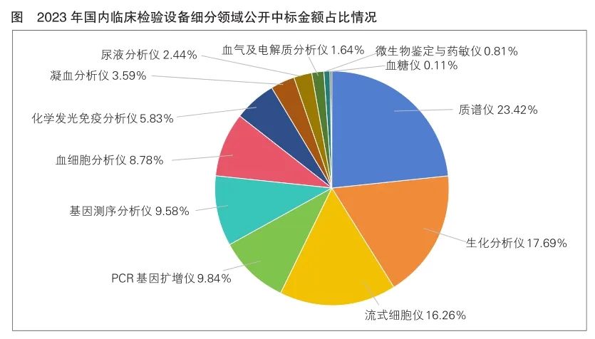 依据2017年发布的《医疗器械分类目录》,临床检验器械子目录包括用于临床检验实验室的设备、仪器、辅助设备和器具及医用低温存贮设备,不包括体外诊断试剂。临床检验器械子目录主要以检验学科和设备性能为依据,分为16个一级产品类别。本报告临床检验设备主要包括血细胞分析仪、尿液分析仪、生化分析仪、血糖仪等12种。 2019—2023年间,国内临床检验设备公开中标金额呈波动增长趋势,2023年达63.15亿元,较2019年增加15亿元左右,年复合增速达到7.19%。 从细分领域来看,2023年我国临床检验设备公开中标金额占比较大的为质谱仪、生化分析仪、流式细胞仪三大细分领域,占比之和近60%(详见图)。 从中标量来看,2023年我国质谱仪国产化率为18.45%,同比下降26.43%。从中标金额来看,2023年我国质谱仪国产化率为17.06%,同比下降31.04%。 2023年,在国内质谱仪中标金额占比居前5位的品牌中,安捷伦的质谱仪中标金额占比与增速都最为显著,占比为31.8%,同比增速达到了70%以上。 从地域来看,2023年我国共有7个省份的质谱仪中标金额占比超过5%。其中,广东的质谱仪中标金额占比超过10%,达到11.31%。 从中标量来看,2023年我国生化分析仪国产化率达到82.34%,同比增长0.20%。从中标金额来看,2023年我国生化分析仪国产化率达到64.26%,同比下降2.66%。 2023年,在国内生化分析仪中标金额占比居前5位的品牌中,迈瑞医疗的生化分析仪中标金额占比超过40%。此外,优利特的增速最为显著,达到了97%。 从地域来看,2023年我国共有5个省份的生化分析仪中标金额占比超过5%,分别是广东、江苏、江西、安徽、河北,占比分别为9.44%、6.48%、5.69%、5.13%、5.08%。 从中标量来看,2023年我国流式细胞仪国产化率达到20.61%,同比增长62.03%。从中标金额来看,2023年我国流式细胞仪国产化率达到5.97%,同比增长60.59%。 2023年,在国内流式细胞仪中标金额占比居前5位的品牌中,碧迪的流式细胞仪中标金额占比达到39%。此外,Cytek的增速最为显著,达到了235%以上。 从地域来看,2023年我国共有6个省份的流式细胞仪中标金额占比超过5%。其中,上海的流式细胞仪中标金额占比达到20.38%,其余省份占比均不足10%。 从中标量来看,2023年我国PCR基因扩增仪国产化率达到39.65%,同比下降40.19%。从中标金额来看,2023年我国PCR基因扩增仪国产化率达到29.84%,同比下降53.85%。 2023年,在国内PCR基因扩增仪中标金额占比居前5位的品牌中,赛默飞世尔的PCR基因扩增仪中标金额占比在25%以上。此外,伯乐增速最为显著,达到了266%。 从地域来看,2023年我国共有6个省份的PCR基因扩增仪中标金额占比超过5%。其中,广东的PCR基因扩增仪中标金额占比达到16.66%,其余省份占比均不足10%。 从中标量来看,2023年我国基因测序分析仪国产化率达到70%以上,同比增长21.82%。从中标金额来看,2023年我国基因测序分析仪国产化率达到65.97%,同比增长20.6%。 2023年,在国内基因测序分析仪中标金额占比居前5位的品牌中,华大智造的基因测序分析仪中标金额占比与增速都最为显著,同比增速达到了107%以上。 从地域来看,2023年我国共有9个省份的基因测序分析仪中标金额占比超过5%。其中,广东、湖北、河北的基因测序分析仪中标金额占比分别为9.08%、7.92%、6.57%。 从中标量来看,2023年我国血细胞分析仪国产化率达到83.22%,同比增长7.58%。从中标金额来看,2023年我国血细胞分析仪国产化率达到74.38%,同比增长6.92%。 2023年,在国内血细胞分析仪中标金额占比居前5位的品牌中,迈瑞的血细胞分析仪中标金额占比在58%以上。此外,帝迈生物增速最为显著,达到了52%以上。 从地域来看,2023年我国共有6个省份的血细胞分析仪中标金额占比超过5%。其中,广东的血细胞分析仪中标金额占比超过10%,达到10.15%。 从中标量来看,2023年我国化学发光免疫分析仪国产化率达到76.46%,同比下降1.89%。从中标金额来看,2023年我国化学发光免疫分析仪国产化率达到62.35%,同比增长1.29%。 2023年,在国内化学发光免疫分析仪中标金额占比居前5位的品牌中,迈瑞、新产业生物、罗氏的化学发光免疫分析仪中标金额占比均在12%以上。此外,亚辉龙和新产业生物的增速较为显著,分别为28.71%和26.84%。 从地域来看,2023年我国共有4个省份的化学发光免疫分析仪中标金额占比超过5%,分别为广东、浙江、江苏、四川,占比分别为9.34%、6.32%、5.69%、5.44%。 从中标量来看,2023年我国凝血分析仪国产化率达到75.87%,同比增长2.38%。从中标金额来看,2023年我国凝血分析仪国产化率达到52.51%,同比下降5.96%。 2023年,在国内凝血分析仪中标金额占比居前5位的品牌中,希森美康、迈瑞的凝血分析仪中标金额占比均在20%左右。此外,积水医疗增速最为显著,达到了666%以上。 从地域来看,2023年我国共有4个省份的凝血分析仪中标金额占比超过5%,分别为广东、山西、上海、安徽,占比分别为11.61%、5.46%、5.21%、5.16%。 从中标量来看,2023年我国尿液分析仪国产化率达到90%以上,同比下降1.24%。从中标金额来看,2023年我国尿液分析仪国产化率达到80%以上,国产化率同比增长6.17%。 2023年,在国内尿液分析仪中标金额占比居前5位的品牌中,优利特的尿液分析仪中标金额占比在25%以上。此外,爱威增速最为显著,达到了240.64%。 从地域来看,2023年我国共有5个省份的尿液分析仪中标金额占比超过5%,分别为湖北、山西、辽宁、广东、吉林,占比分别为8.15%、7.53%、6.83%、