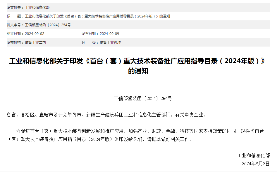2023年9月,工信部、发改委 国资委三部门发布《关于支持首台(套)重大技术装备平等参与企业招标投标活动的指导意见》,提出——