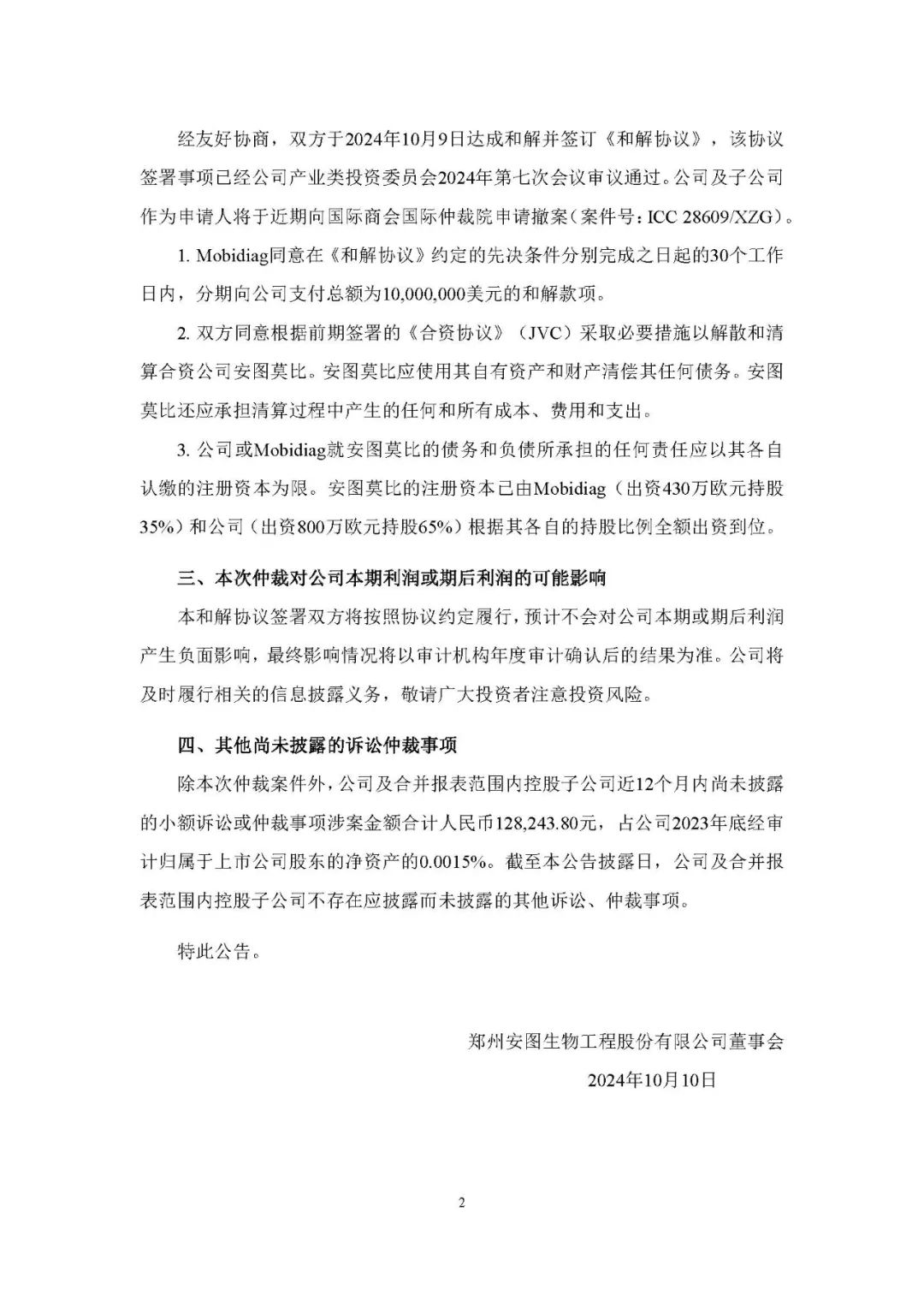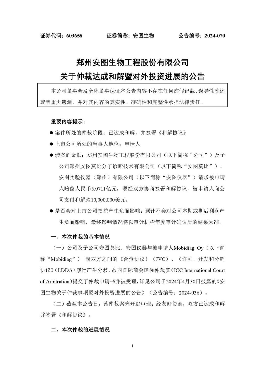 安图生物10月10日公告,公司及子公司安图莫比、安图仪器与被申请人Mobidiag Oy 就双方之间的《合资协议》(JVC)、《许可、开发和分销