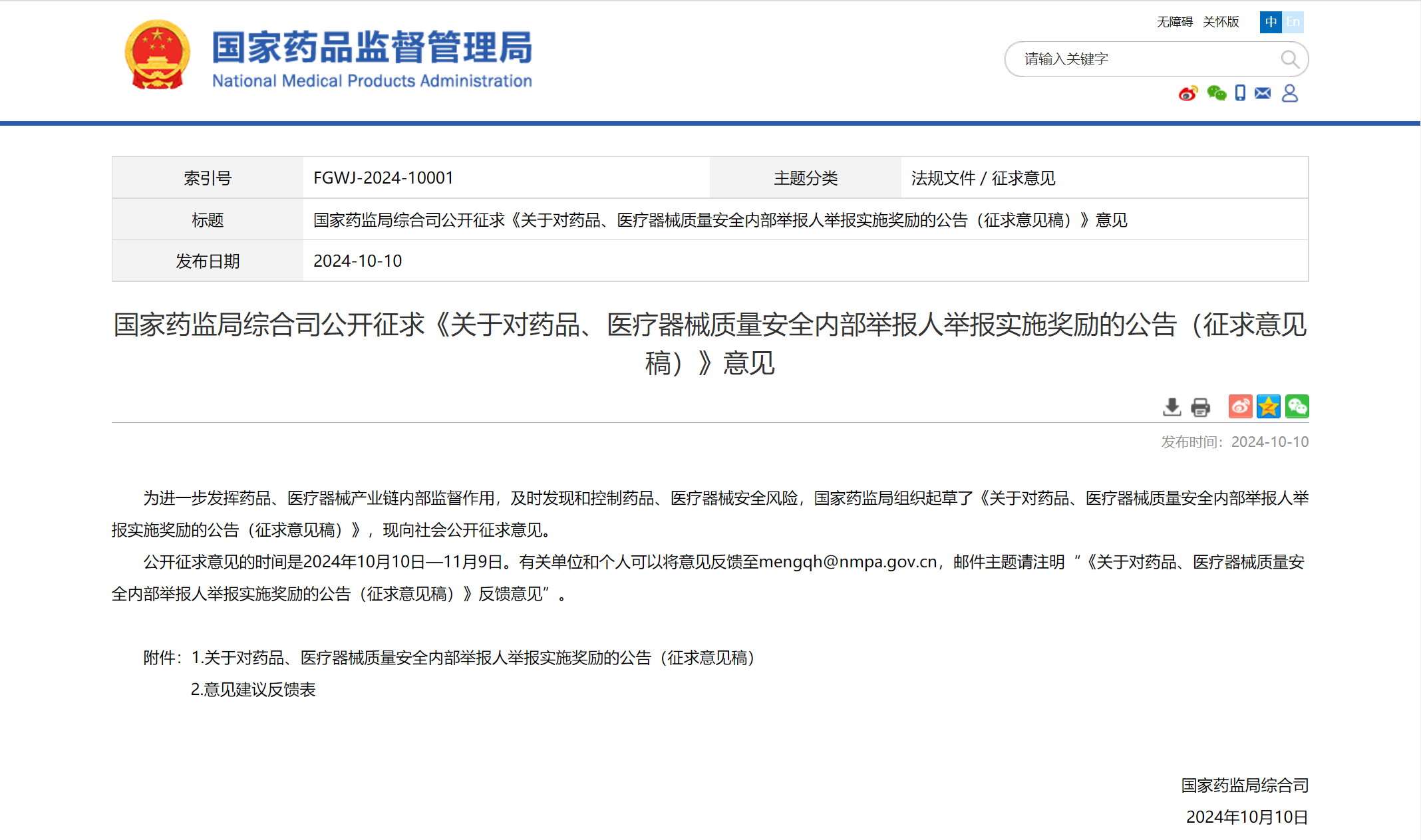 10月10日,国家药监局发布《关于对药品、医疗器械质量安全内部举报人举报实施奖励的公告》征求意见稿,公告拟对的药品、医疗器械质量安全内部举报人实施奖励