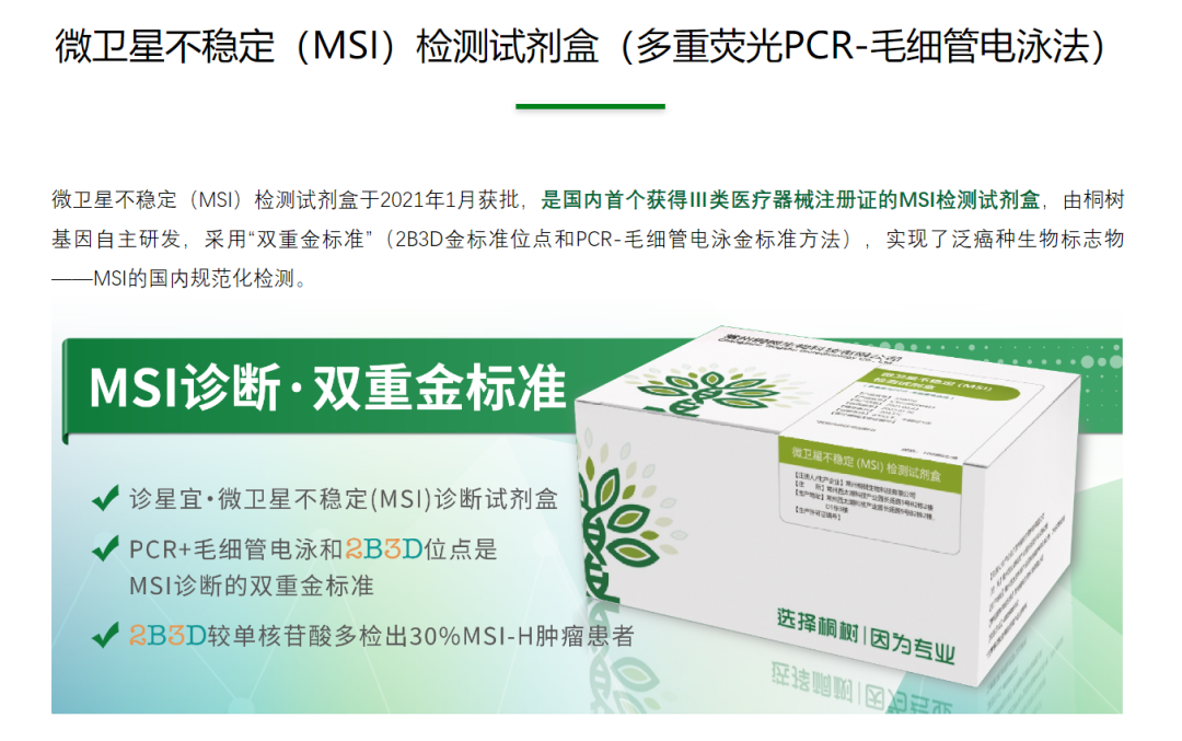 桐树基因自主研发的微卫星不稳定检测试剂盒于2021年1月获国内MSI检测首张三类医疗器械注册证,在胃癌、结直肠癌、乳腺癌等17种肿瘤检测领域具有唯一的先发优势。