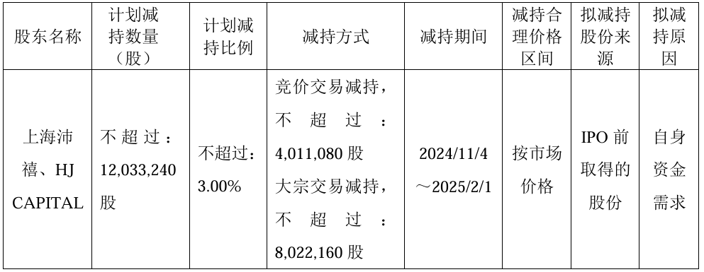 10月14日,科美诊断发布公告称,科美诊断股东上海沛禧及其一致行动人HJ CAPITAL拟通过集中竞价交易、大宗交易方式减持公司股份,合计减持不超过12,033,240股,合计减持比例不超过公司股份总数的3.00%。自公告披露之日起15个交易日之后的90日内进行。 若按照10月14日收盘价6.60元/股计算,此次减持预计可套现7942万元。 截至本公告日,公司股东上海沛禧及其一致行动人HJ CAPITAL分别持有公司股份17,708,910股、11,273,384股,合计持有28,982,294股,分别占公司总股本的4.41%、2.81%,合计占公司总股本的7.23%。 |