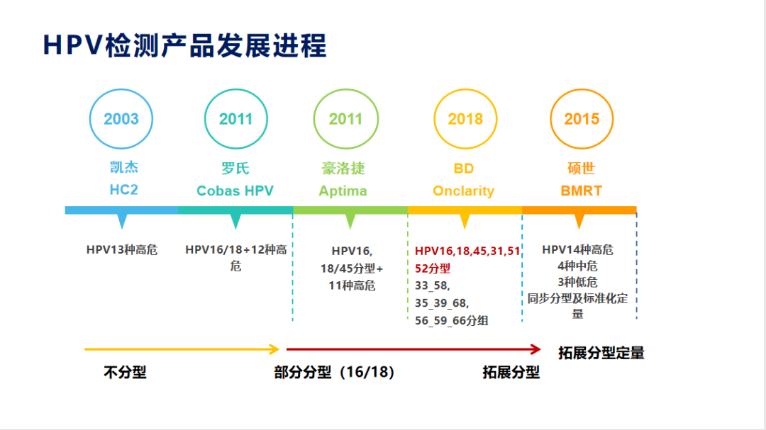 总体来说, 美国FDA批准的HPV产品从不分型、到部分分型(分16/18型)、再到拓展分型(分6个型),朝着精细化、精准化的方向在发展。随着检测技术的进步和临床研究数据的积累,预计未来FDA将批准HPV全分型以或HPV分型定量的相关产品。