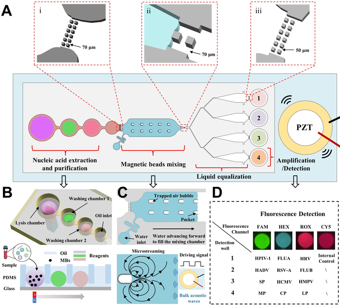 集成微流控芯片。图片来源于《分析化学》 卞晓军介绍,这项研究的核心在于高度集成化的设计。芯片整合了磁珠核酸提取与纯化、声流驱动混合、液体等量分配以及多重PCR扩增和原位荧光检测等多个步骤,实现了样本处理到结果分析的全自动化流程。研究团队利用微柱和气泡捕获阵列结构,实现了磁珠的高效混合,能够在35秒内完成混合,为后续核酸提取和检测提供均匀的磁珠混合物。同时,研究团队利用油包水体系有效防止了交叉污染。 “这一成果不仅提高了检测效率,也大大缩短了诊断时间,整个检测过程仅需约70分钟。该芯片对多重病原体的分析能力、灵敏度和检测速度,均优于现有大多数用于分子诊断的微流控芯片。”卞晓军表示,芯片可检测到浓度低至每微升10拷贝的病原体。在临床鼻拭子样本的验证中,芯片展现了出色的多重病原体分析能力,能够准确检测单一病原体和混合感染病原体。总之,该研究展示了一种先进的集成微流控设备,能够在单个芯片上同时检测 12 种呼吸道病原体。从样品加载到荧光读数的整个工作流程仅需 70 分钟。创新设计具有矩形腔室和具有可变间隙的微柱,有助于高效执行芯片的整个操作过程。此外,采用油封装水滴系统可有效降低试剂污染的风险,这是传统管内 PCR 方法中的常见问题。与各种基于微流体芯片的分子生物学方法相比,该测定表现出相当或卓越的灵敏度和速度,使其成为现场同步诊断和监测各种病原体感染的有前途的工具。相关论文信息:https://doi.org/10.1021/acs.analchem.4c00990 |