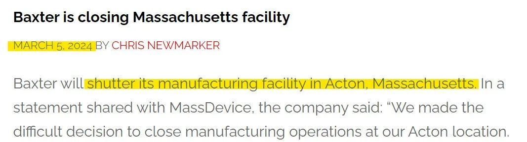 自2022年起,广东11省联盟开展集采,首次将血液制品和基础输液纳入集采范围,打破了原有血液制品难以入集采的惯例。 据公开数据统计,血液制品全国采购规模350亿-400亿元。 #美国市场:供应短缺 2024年9月30日,百特北卡罗来纳工厂被洪水淹没,桥梁被飓风损坏,该工厂有2500名员工,是百特最大的生产基地。 *2024年9月29日,百特首次通知公众,其位于北卡罗来纳州的工厂将因飓风而关闭。 百特于1972年在北卡罗来纳州开设工厂。美国医院协会表示,飓风来临之前,该工厂每天生产150万袋静脉注射液,占全国供应量的60%,并且是腹膜透析解决方案的重要供应商。 由于医院就静脉注射液短缺的问题发出了警告,百特一直在努力恢复其北卡罗来纳州工厂的生产,并扩大其他工厂的生产。 百特表示,该工厂生产的所有产品最早将在11月中下旬分发。目标是在今年年底前开始分阶段恢复生产。 # 积极求变 2024年8月13日,百特医疗和全球投资公司凯雷(纳斯达克代码:CG)宣布,双方已签署最终协议,凯雷将以38亿美元收购百特的肾脏护理业务,该业务将命名为Vantive。 Vantive为腹膜透析、血液透析和重要器官支持疗法提供包括连续肾脏替代治疗(CRRT)在内的产品和服务。该业务在全球拥有超过23000名员工,2023年的营业额为45亿美元。 根据最终协议的条款,在完成特定的结算调整后,百特将收到约35亿美元的现金,预计税后净收益约30亿美元。交易预计将于2024年底或2025年初完成,需获得常规监管批准并满足其他成交条件。 在完成计划中的肾脏护理业务出售后,百特的目标为在创新和持续的市场拓展推动下,每年实现4%至5%的经营性销售增长。 2025年,公司预计调整后的营业利润率约为持续经营收入的16.5%,其中反映了因滞留成本,预期的过渡服务协议(TSA)收入,以及公司将在肾脏护理部门剥离完成后签订的制造供应协议(MSA)而导至的预计100个基点的负面影响。 百特将继续优先考虑资本分配,并期望将投资导向更高增长、更高回报的机会,以推动增量价值提升。 此外,2024年3月,百特决定关闭马萨诸塞州的工厂并裁员。2023年期间,百特宣布关闭其过往投资超28亿的阿拉巴马州欧佩莱卡工厂;同时宣布将裁去至多5%的员工,数量将达3000人等。 2023年5月,百特将其生物制药解决方案业务(BPS),卖给了全球知名私募股权公司华平投资和安宏资本,后两者将向百特支付42.5亿美元现金,最终转化为税后约34亿美元的净收益,用于偿还债务。 # 结语 2024年10月25日,百特中国发布通知,百特的肾脏护理业务——包括肾脏护理和急重症治疗业务——在出售完成后,新公司将命名为万益特Vantive(受监管审批等条件限制)。 在百特肾科进入中国第35年之际,万益特将首次在中国国际进口博览会介绍全新品牌。借助进博会这一开放与合作的重要平台,万益特聚焦腹膜透析、血液透析、急重症治疗三大领域,携多款领先的明星产品及治疗解决方案重磅亮相。我们拭目以待。 |