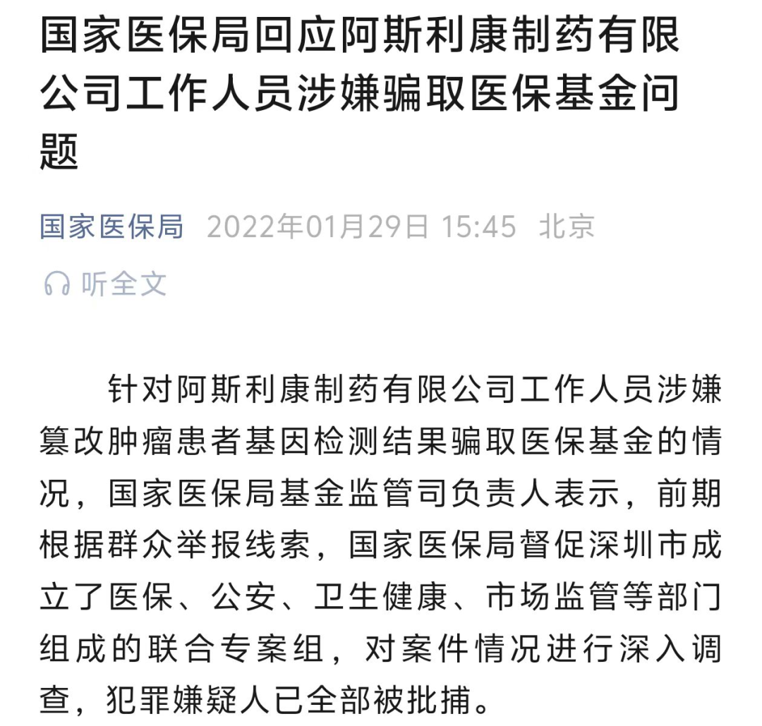 今年3月时,阿斯利康和无锡市签订协议,在无锡高新区投资4.75亿美元新建小分子药物工厂。无锡是阿斯利康的发家地,1993年阿斯利康的前身阿斯特拉公司就在无锡落户。30多年里阿斯利康至少在无锡投资10亿美元,今年的这一笔是最大的。不仅如此,今年8月底阿斯利康在青岛宣布,增加青岛吸入气雾剂生产基地项目至7.5亿美元。今年光是这两笔投资,阿斯利康承诺的投资总额就达到了开放的大门果然迎来了源源不断的投资,地方上当然非常欢迎。其实在这两场重要的合作签约仪式上,王磊都露面了。但是,圈子里之所以会有些传言,还是因为肇始于2021年的骗保事件一直没有明确的结论。2022年1月,国家医保局突然披露:阿斯利康工作人员涉嫌篡改肿瘤患者基因检测结果骗取医保基金。阿斯利康方面随后也发文称:深圳市少数员工参与了骗保行为,公司已进行了严肃处理,今后保证合规。但那之后,有关阿斯利康员工骗保的新闻就间或出现,北京、福建、江西、上海等多地都出现过类似案件。种种迹象表明:骗保并非个体事件,而且针对阿斯利康的调查并未停止我们在之前的文章《阿斯利康爆惊天丑闻》中,对2022年的骗保事件有过详细的介绍,就不再细讲了。在那之后,各地又有阿斯利康的员工因为骗保被查,只是未能引起媒体广泛关注。但神奇的是,过去3年间,阿斯利康中国区的业务似乎并没受到合规从严的影响,一直保持优良。只是阿斯利康管理层和业务架构在这几年反复调整,加上时不时出现的传闻和消息,外界一直有一种感觉:笼罩在阿斯利康头顶上的阴云还没散。 王磊接受调查,表明阿斯利康的盖子终于要全部揭开了。