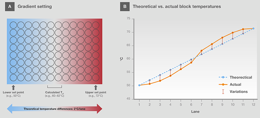 由于引物和靶标序列之间的退火过程对于成功获取PCR结果至关重要,退火温度通常都需要进行优化。为了实现对于不同温度的同时检测,梯度热模块被开发出来,以实现在单一金属模块两端设置接近理论退火温度的高、低温(A)。也有一种“Better-than-gradient”技术,通过使用绝热的独立热模块来取代单一的模块(B)。
