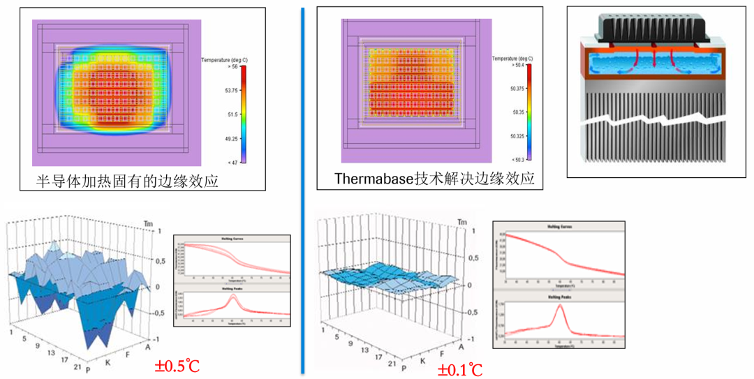 使用传统的加热模块,最需要关注的边际效应问题,由于与外界更加剧烈的热交换过程,靠近模块边缘的孔往往扩增效果与靠近中心的反应孔有差异。一般半导体温控原件的功率和性能越好,则边际效应影响程度就越低。