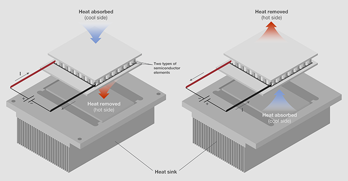 Peltier模块的基本原理:两种不同的材料(在这里是半导体)被连接时,根据不同的电流方向会产生热或发生热吸收。