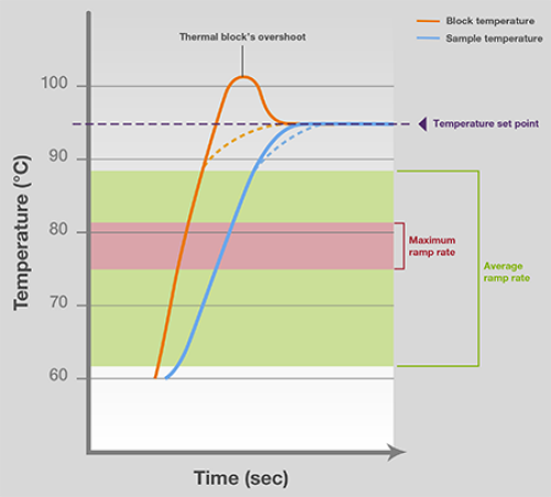 PCR仪的升降温速度意味着在一定时间内发生的PCR步骤之间的温度变化,并通过用摄氏度每秒(°C/sec)作为单位。相应的“升温”和“降温”分别代表着热模块的加热和冷却过程。