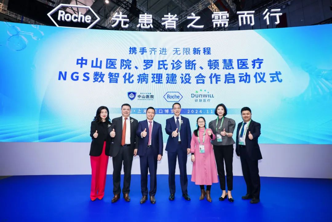 (2024年11月6日,上海)在第七届中国国际进口博览会上,罗氏诊断与复旦大学附属中山医院(以下简称“中山医院”)、上海顿慧医疗科技发展有限公司(以下简称“顿慧医疗”)共同宣布,将携手推进NGS(Next-Generation Sequencing,新一代测序技术)数智化病理建设合作,打造基于本土转化需求的“样本进,结果出”(Sample in result out)全流程自动化NGS检测方案,携力推动临床研究、技术创新以及科研成果落地转化,共同促进精准医疗领域的高质量发展。 复旦大学附属中山医院院长助理、临床医学研究院执行院长汤其群,复旦大学附属中山医院病理科主任侯英勇,罗氏诊断中国总经姚国樑,罗氏诊断中国高级总监-生命科学部王峰,上海顿慧医疗科技发展有限公司创始人、董事长温冬,上海顿慧医疗科技发展有限公司市场及战略发展中心执行总监侯瑛共同出席了启动仪式。 图:中山医院、罗氏诊断、顿慧医疗--- NGS数智化病理建设合作启动仪式 NGS技术是现代基因组学和个体化医疗的核心工具,因其高通量、低成本和广泛的应用前景,极大地推动了精准医疗的发展,目前已在遗传病筛查、产前检测、肿瘤诊断与治疗、感染性疾病原体检测等多个领域得到广泛应用。随着政策的逐步完善和技术的进步,NGS在精准医疗和个体化医学中发挥着越来越大的作用。然而,由于数据处理的复杂性和对高精度、高速度的要求,NGS技术落地转化仍面临着巨大的挑战。因此,实现NGS技术的自动化、数字化、智能化,既是技术发展的必然趋势,也是临床需求的迫切呼唤。 全流程自动化NGS解决方案是罗氏诊断在中国市场深耕的成果,依托其在测序领域的丰富经验与创新技术,联手本土创新转化型企业——顿慧医疗,进一步迭代和全面升级NGS“样本进、结果出”的数字化、智能化整体解决方案,打造符合中国临床分析与应用需求的本土化合作新样板。