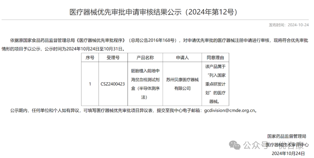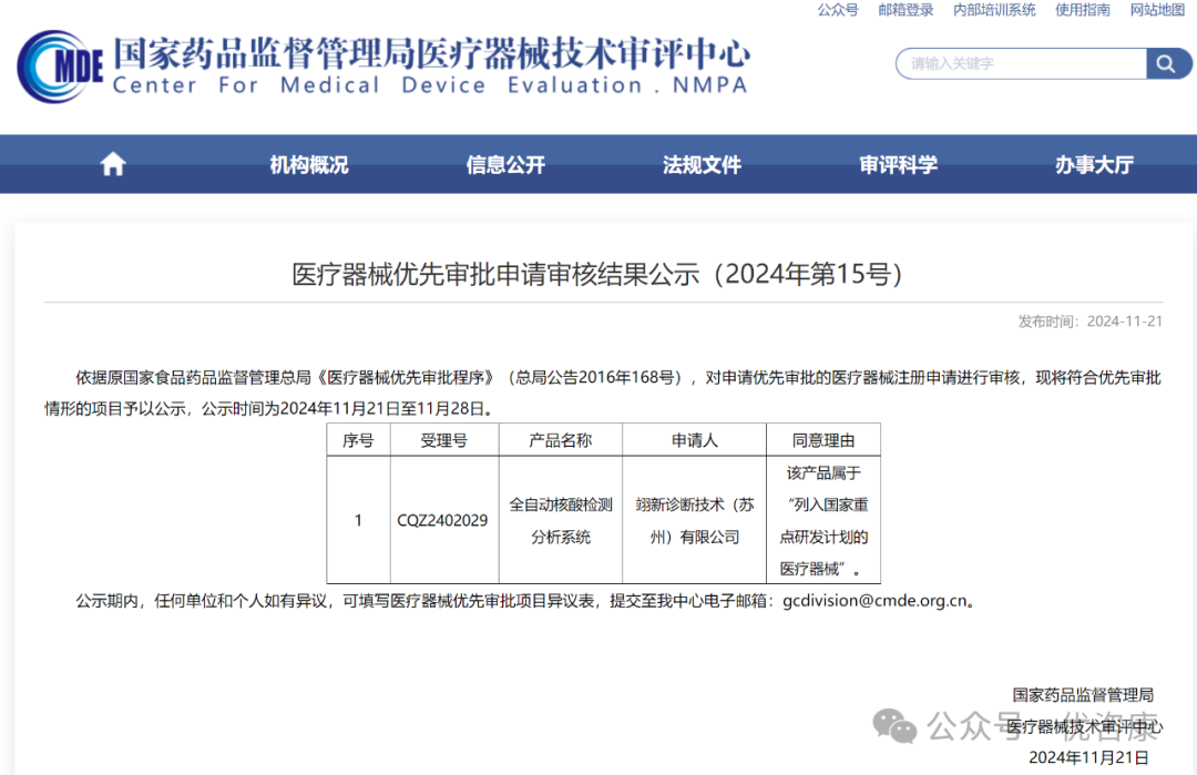11.21号,翊新诊断技术(苏州)有限公司一款IVD领域产品进入优先通道,其同意理由为“该产品属于“列入国家重点研发计划的医疗器械””,
