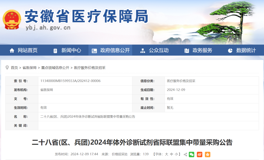 12月9日,安徽省医保局发布文件,关于《二十八省(区、兵团)2024 年体外诊断试剂省际联盟集中带量采购文件(1号)》。