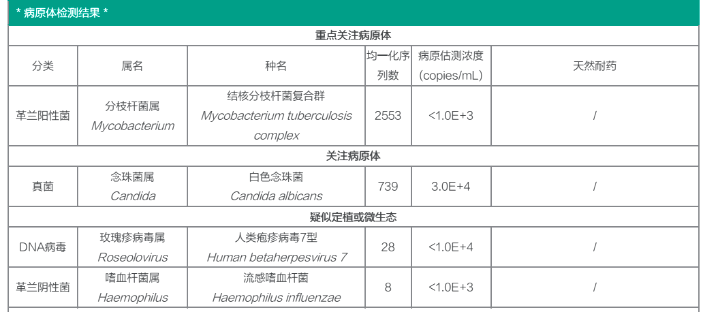 病原估测浓度(copies/mL):通过生物信息学方法计算样本中微生物含量,该结果并非绝对定量,仅供临床参考。