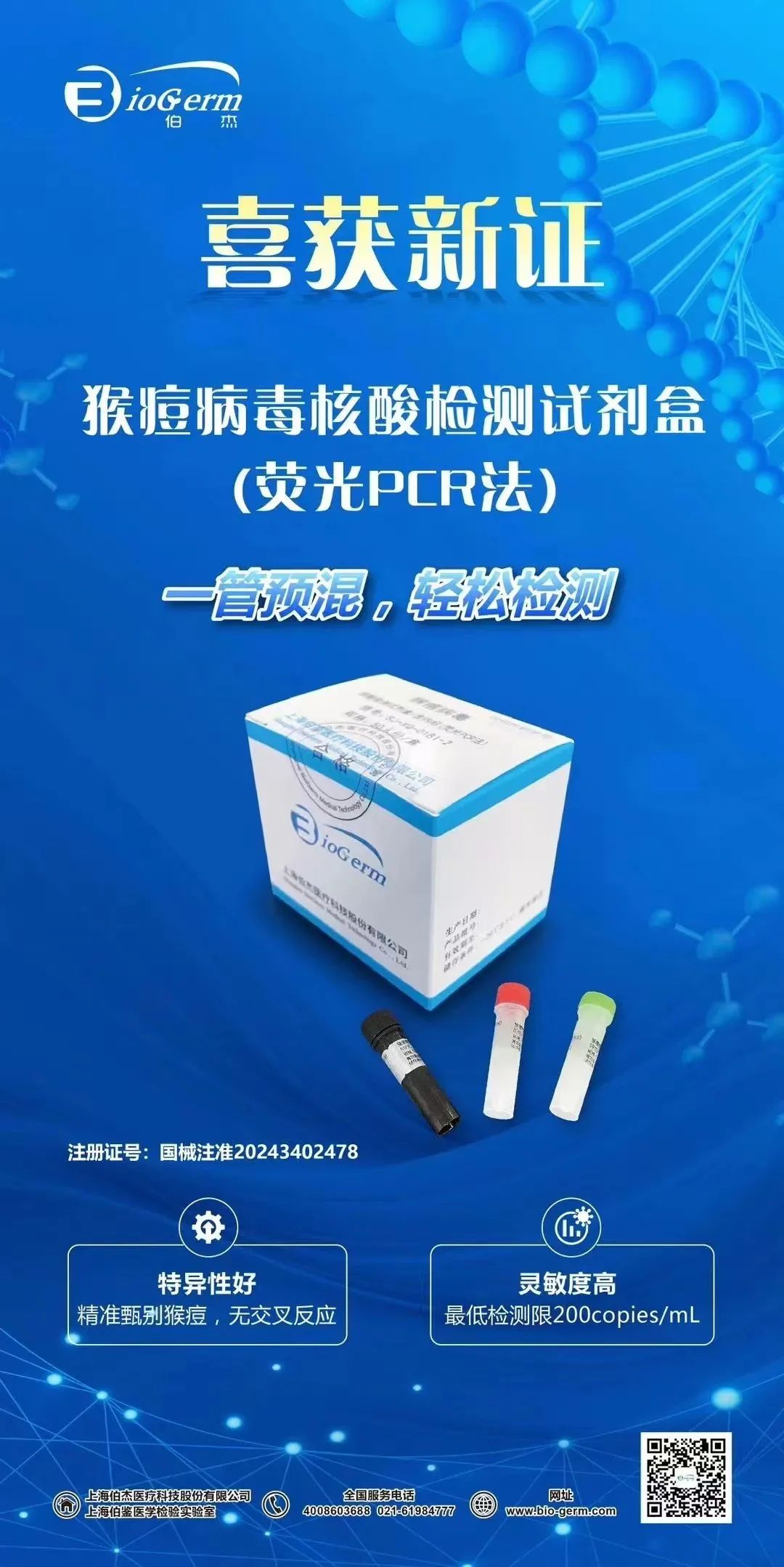 国内首家一管预混猴痘病毒核酸检测试剂上市!超百家疾控海关应用,国际三重认证,一管预混,40分钟快速精准检测,轻松应急检测 猴痘疫情:全球性的挑战 猴痘病毒,作为一种人畜共患病,其自然宿主包括多种啮齿类和灵长类动物。自1970年起,已有11个非洲国家报告了人类猴痘病例。然而,2022年5月,猴痘疫情的全面爆发标志着一个转折点,疫情迅速扩散至全球114个国家,累计确诊病例达到89596例,死亡157例。 在国际公共卫生领域,猴痘疫情的再次升温无疑给全球各国的疫情防控体系带来了前所未有的挑战。2024年,随着世界卫生组织(WHO)宣布猴痘疫情构成“国际关注的突发公共卫生事件”(PHEIC),猴痘病毒引发的疾病成为了全球关注的焦点,其严重性和紧迫性被重新评估。2024年8月14日,WHO宣布,鉴于非洲多国猴痘疫情的不断升级,猴痘疫情再次被定性为PHEIC,这是自2022年7月以来,WHO第二次发布此级别的警报。根据WHO的最新数据,截至2024年10月31日,全球已有126个国家报告了猴痘病例,累计实验室诊断病例达到115101例,其中255例不幸死亡。这些数字凸显了猴痘疫情对全球健康的威胁,以及全球合作应对疫情的迫切需求。 2024年8月15日,我国海关总署发布关于防止猴痘疫情传入我国的公告:对于重点入境人群开展监测。 国内防控重点:开展多渠道监测 根据国家疾控局、国家卫健委发布的《猴痘防控方案》,开展医疗机构、重点人群、入境人员和重点场所等多渠道监测是防控猴痘的重要一环。 1.医疗机构监测 各级各类医疗机构要开展猴痘样症状监测,尤其是皮肤(性病)科、肛肠科、艾滋病自愿咨询检测门诊等要重点关注猴痘样症状者。 发现猴痘样症状者,应主动询问流行病学史,记录患者现住址及联系方式采集标本送疾控机构进行猴痘核酸检测。 具备猴痘病毒检测能力及猴痘病毒实验活动资质的医疗机构也可开展检测。 2.重点人群监测 各级各类医疗机构、疾控机构在对 MSM※ 等重点人群开展诊疗或检测咨询服务时,应主动询问是否有猴痘样症状及其可疑接触史。 如发现猴痘样症状者和疑似病例,应及时采集标本进行猴痘病毒核酸检测。 3.入境人员监测 海关收到猴痘相关异常健康申报或检疫 发现有猴痘样症状的入境人员,应及时进行标本采集和核酸检测,并发放《就诊方便卡》,要求其尽快就诊; 对于核酸检测阳性者,将相关信息通报辖区疾控机构,由相关部门进一步调查处置。 4.重点场所污水监测 有条件的地区可根据当地疫情形势, 经评估对 MSM 经常出入的酒吧、会所、浴池等重点活动场所开展污水监测。 医院监测要求 尽早核酸检测,明确诊断 根据《猴痘医院感染防控专家共识》要求预检分诊、门急诊发现猴痘病例确诊或疑似病例后,应派专人在做好个人防护的情况下,将其护送至发热门诊或隔离病房进一步排查和隔离救治,明确诊断后,确诊病例宜转运至隔离病区或定点医院集中隔离教治。 对于符合上述条件病例,或具有典型临床表现者,应尽早采集标本做MPXV核酸检测,同时应进行水痘、麻疹、带状疱疹等病原学的检查,尽快明确诊断。 猴痘病毒的实验室检查 1.一般检查 外周血白细胞正常或升高,血小板正常或减少。部分患者可出现转氨酶水平升高、血尿素氮水平降低、低蛋白血症等。 2.病原学检查 核酸检测:采用核酸扩增检测方法在皮疹、疱液、痂皮、口咽或鼻咽分泌物等标本中可检测出猴痘病毒核酸。 3.病毒培养 采集上述标本进行病毒培养可分离到猴痘病毒。病毒培养应当在三级及以上生物安全实验室开展。 伯杰猴痘病毒核酸检测试剂盒 助力对猴痘的实验室鉴别和常规检测 伯杰猴痘核酸检测试剂已在全国众多疾控中心和海关单位得到广泛应用,覆盖全国33个省、直辖市和自治区,其性能和可靠性得到了广泛认可。 一管预混 反应体系全预混,无需手工配置,操作更简便。 快速检测 扩增时间约40min,助力猴痘病例快速检测。 敏感性高 最低检测限200 copies/mL,结果精准可靠。 全程监控 内源性内参设置,全流程监控样本采集及保存运输、核酸提取、扩增检测。 防污染体系 加入dUTP-UDG酶系统,有效减少扩增产物的污染,避免结果假阳性。 覆盖全面 可覆盖最新变异毒株,防止漏检。 |