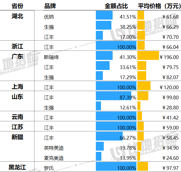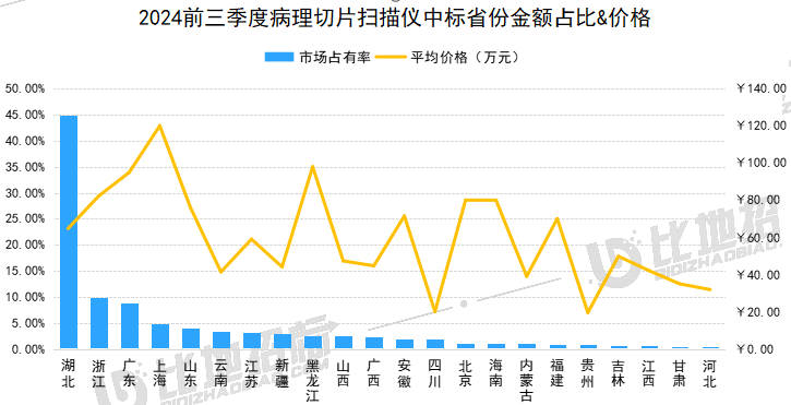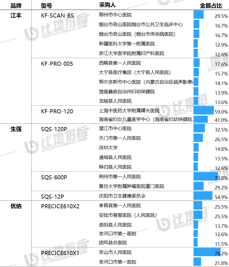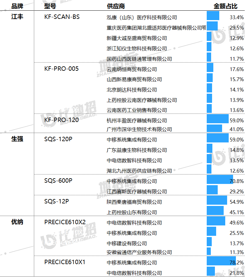 据比地招标网统计:2024年前三季度,病理切片扫描仪招投标市场有102家采购单位,82家中标单位,中标设备数量达125台,中标总金额约1.03亿元。 (产品关键词:病理切片扫描仪、数字病理切片扫描仪、玻片扫描影像系统等) 01 品牌市占率 设备品牌方面,金额市占率较高的品牌有江丰、生强、优纳,市占分别为43.47%、24.07%、19.12%。前3品牌合计占比达87%,品牌集中度非常高。 数据来源:比地招标网 02 区域占比与价格 区域方面,湖北、浙江、广东,中标金额占比分别为44.79%、9.84%、8.84%,前三区域合计占比达63%,区域集中度非常高。 价格方面,上海、黑龙江、广东平均金额相对较高,平均单价分别为120.00万元、97.97万元、94.91万元;四川、贵州平均金额相对较低,平均单价分别为20.07万元、19.51万元。 数据来源:比地招标网 03 TOP地区品牌偏好 不同地区对品牌的偏好有所不同,湖北偏好优纳、生强、江丰;浙江偏好江丰;广东偏好斯瑞缔、江丰、生强等。 数据来源:比地招标网 04 主流品牌型号 主要品牌型号金额占比&价格 主流品牌型号包括,江丰的KF-SCAN-BS、KF-PRO-005、KF-PRO-120;生强的SQS-120P、SQS-600P、SQS-12P;优纳的PRECICE610X2、PRECICE610X1等。 数据来源:比地招标网 05 主要采购人 主要采购单位及对应中标品牌包括:鄂州市中心医院(江丰),潜江市中心医院(生强),安陆市普爱医院(人民医院)(优纳)等。 TOP3品牌型号采购人采购金额占比 数据来源:比地招标网 06 主要供应商 主要供应商及对应中标品牌包括:泓康(山东)医疗科技有限公司(江丰),中移系统集成有限公司(生强),中电信数智科技有限公司(优纳)等。 TOP3品牌型号供应商中标金额占比 数据来源:比地招标网 // 数据说明 文丨比地招标研究院 统计时段:2024年1月1日~2024年09月30日 产品关键词:病理切片扫描仪、数字病理切片扫描仪、玻片扫描影像系统等。 数据来源:各政府采购、公共资源交易中心、企事业单位等网站公开的招标采购项目信息,基于招标采购大数据挖掘分析整理。 报告声明:本报告数据来源于各类型采购信息公开网站的采购项目信息,由于采购信息的非完全披露所导至的误差等原因,各项数据及指标仅供参考。 |