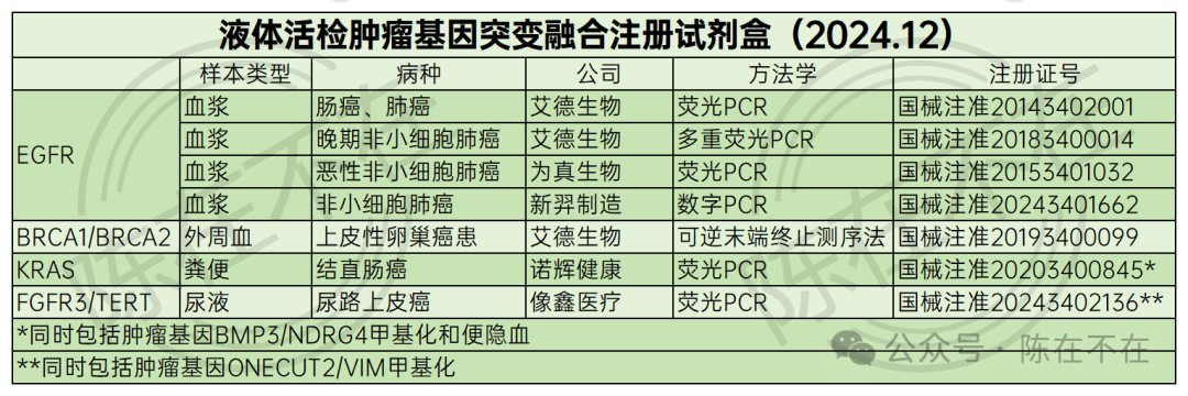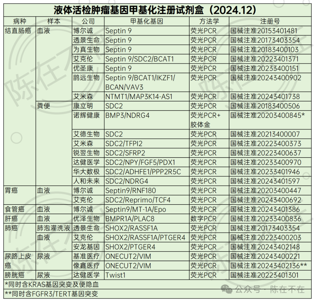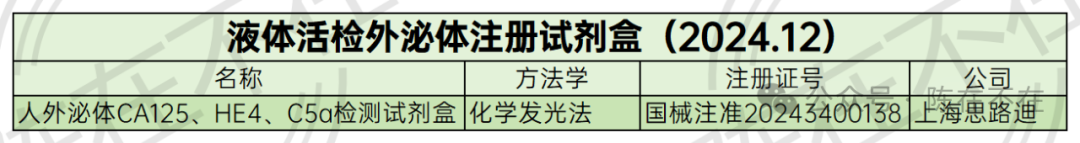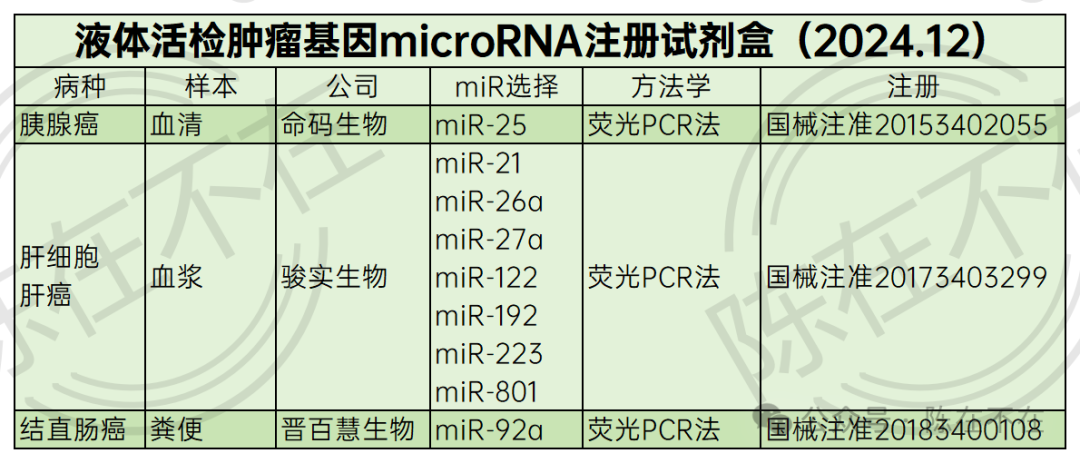 主要是EGFR基因突变试剂盒。 还有两个是与基因甲基化联合检测。 艾德生物拥有第一个肿瘤NGS液体活检注册试剂盒,以及多个PCR液体活检试剂盒,不愧是肿瘤基因行业的No.1,断崖式的存在。 肿瘤基因甲基化 截止到2024年12月,基因甲基化获证32个,其中:31个与肿瘤相关;1个为系统性红斑狼疮。肿瘤基因甲基化试剂盒中:1个样本为石蜡切片,5个为宫颈脱落细胞,其余25个液体活检试剂盒见下表。 microRNA microRNA(miRNA)是一类内生的、长度约 20 - 24 个核苷酸的非编码单链 RNA 分子。 截止到2024年12月,microRNA获证试剂盒3个,见下表。 循环肿瘤细胞 循环肿瘤细胞(CTCs)是一群被认为从原发性肿瘤或转移性肿瘤部位脱离,并在血液中循环的肿瘤细胞。由于它们是完整的活细胞,在循环系统中具有较长的半衰期,并且提供了一些无法通过 ctDNA 分析获得的参数,包括 RNA 和蛋白质分析以及完整的基因组。 捕获 CTCs 进行分析存在重大挑战。CTCs 是罕见事件,即使在转移性癌症患者中,也并不总是存在于外周血中。即使存在,其浓度也非常低,处于每十亿个红细胞和数百万个白细胞中只有一个 CTC 的范围。CTC 标志物可能与原发性肿瘤细胞的标志物不同,并且在治疗过程中也可能发生变化,这使得它们难以靶向定位。 根据《2023年第三次医疗器械产品分类界定结果汇总》,以下建议按第三类医疗器械管理: (四十七)血液循环肿瘤细胞自动分选仪:由精密加样系统(由传输系统、清洗系统、温育系统、混匀系统、软件系统组成)和分选系统(由磁珠吸附模块、样品和磁珠混匀模块、离心模块、照明和UV消毒模块组成)组成。与荧光原位杂交样品处理试剂盒配合使用,用于循环肿瘤细胞的富集,经提取后的细胞用于后续染色计数或其它靶标物质检测。分类编码:22-10。 外囊泡 目前,肿瘤外泌体获证试剂盒仅思路迪一家。通过体外测定人血清外泌体中的CA125、HE4和C5a浓度,并经给定的计算公式计算卵巢癌评分OCS(ovarian cancer score) ,适用于临床上发现有附件包块的女性患者,辅助诊断上皮性卵巢癌。 以上为肿瘤液体活检NMPA注册产品。NIPT及生殖健康,器官移植等方面的液体活检产品未在此列。 液体活检作为一种新兴的肿瘤检测技术,具有无创、可重复等优点,但在临床应用和推广过程中仍面临着诸多挑战: