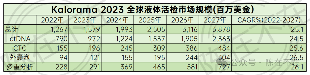 根据Kalorama 2023年液体活检市场报告,2022年全球液体活检市场为 12.6 亿美元,预计将以 25.1%的复合年增长率(CAGR)增长,到 2027 年达到 38.8 亿美元的规模。