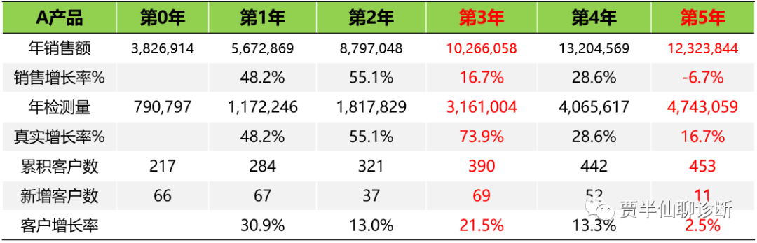 从上表可以看出在第三年A产品首次降价33%时,销售额只增长了16.7%,是低于对照组23.7%的增长率的。但是新增客户数增加了69家,试剂使用量更是增长达到73.9%,所以这次的直接降价带来的销售量增加非常明显。也为第四年的爆发式增长蓄力
