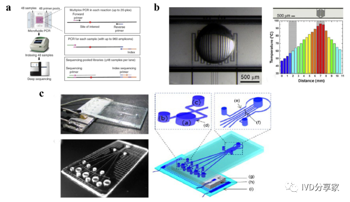 微流控PCR芯片概览 2、结合qPCR的微流控芯片 3、结合mPCR的微流控芯片 4、结合dPCR的微流控芯片 ddPCR技术将PCR反应液分成大量的纳升至皮升,同时在这些小液滴中进行PCR扩增,分析扩增后液滴的荧光信号,计算出目的基因的拷贝数。以液滴为反应单元的PCR系统系统结构更简单,成本更低,结果更准确。Chen等人使用水相通过微通道阵列分散成稳定的油包水乳液液滴,并进行高动态范围的dPCR反应。事实证明,这种经济有效的方法不仅节省了复杂的微流控设备和控制系统,而且大大抑制了材料损失和交叉污染。此外,Wang等人使用压缩空气驱动流体产生液滴,无需外部微阀即可实现实时监测。该系统只需要一个恒温加热器即可实现dPCR所需的稳定热循环,实现每个热循环中液滴荧光的实时检测,简化了传统的dPCR过程。 在现有的一些ddPCR系统中,液滴发生器产生液滴后,需要将液滴转移到其他模块进行扩增和检测,可能会导至转移过程中液滴丢失,结果不准确。在转移过程中存在交叉污染的风险。如张等人采用喷墨打印技术,在油相中产生单分散液滴,然后稳定分散到毛细管中,简化了乳化过程,大大减少了试剂的损失,且生成的液滴在不同温度下是连续的。该方法应用于携带目标DNA的阳性液滴,并利用该系统对三个数量级不同数量的DNA进行定量评估。Wei等人开发了一种新型 dPCR 芯片,它将液滴产生、液滴阵列自组装、PCR 扩增和荧光检测集成到一个设备中。它的特点是制造成本极低、定量能力强且有小型化的潜力,满足DNA分子定量标准。 随着微流控技术的成熟,基于微流控技术的dPCR技术发展迅速。两者结合可以避免繁琐的样品分散操作,在短时间内自动形成一大型的独立反应单元,通量高,提高了准确度和灵敏度。与传统的qPCR技术相比,dPCR技术具有极高的灵敏度、精密度和特异性,特别适用于细微的拷贝数变异、稀有基因突变和核酸绝对定量。广泛应用于医疗、微生物检测、食品安全等领域。 微流控PCR芯片的结构类型 不同样式的微流控PCR芯片的示意图。红色表示变性,蓝色表示退火,黄色表示延伸 1、Micro-chamber PCR chips 3、Spiral microchannel PCR chips 4、Oscillating-flow PCR chips 5、 Closed-loop PCR chips 6、Straight channel PCR chips 7、Others PCR chips 微流控PCR芯片的应用 随着微流控技术的快速发展,微流控PCR芯片正朝着结果简单、功能集成、便携和一次性的方向发展。微流控PCR芯片现在被用于识别病原体、核酸病毒和基因突变,以及预测和诊断疾病和检测低浓度样品。COVID-19正在席卷全球,尤其是现在。我们的共同目标是创造既便携又集成的核酸检测技术。微流控PCR芯片技术的进步,赋予了生物、医学等领域巨大的应用价值。 1、与病原体检测相关的微流控PCR芯片 2、与核酸病毒检测相关的微流控PCR芯片 3、基因突变检测相关的微流控PCR芯片 4、与疾病预防和诊断相关的微流控PCR芯片 5、与DNA甲基化检测相关的微流控PCR芯片 6、与低丰度样品检测相关的微流控PCR芯片 结论和未来展望 尽管典型的PCR反应过程简单明了,化学扩增效果明显,但对硬件条件的依赖仍然是PCR广泛使用的一个重要障碍。提高热循环率、最小化设备和使用更少的化学品需要进一步开发。传统的台式热循环仪仪器体积大,试剂消耗大,导至系统热容量增加,进而降低了温度转变速率和反应速率。这些缺陷可以通过PCR设备的小型化来解决。近几十年来,微流控PCR设备的发展有了很大的进步,改变了传统的核酸扩增PCR方法体积大、成本高、耗散大、易污染和降解等问题。热传导速度加快,提高了热循环的效率。 微流控PCR已与多种检测方法相结合。其中,荧光检测是最灵敏、最方便的检测方法。开发低成本、高通量、高速的检测方法是未来研究的重点。系统集成和自动化可以减少手工操作、减少交叉污染及试剂和样本消耗。在COVID-19的趋势下,集自动化和小型化于一体的检测平台是未来的发展方向。 本综述讨论了PCR技术(PCR、RT-PCR、dPCR、mPCR)与微流控芯片上各种通道结构的结合,并介绍了相关的检测方法。还总结了一些已报道的生物分子分析应用,由于芯片加工制造平台还不够普及,微流控PCR技术设备仍需要更好的改进。核酸提取、扩增和检测的一体化将是未来研究的重要方向。 本研究得到国家自然科学基金面上项目(81973569, 21727814, 21621003, 82130113)、四川省科技厅重大专项(2019YFSY0046)、四川省科技厅区域创新合作项(2020YFQ0032)等资助。 原文链接:https://doi.org/10.1016/j.trac.2022.116737 |