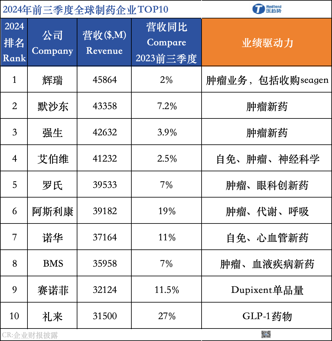 2024年前三季度全球顶级药企TOP10