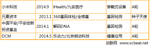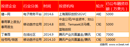 在动脉网互联网医疗研究院的统计数据中,列出了2013-2014YTD参与投资数量在4起以上的投资机构,共计5家,对这些活跃投资机构及投资的互联网医疗案例进行了总结和整理。 互联网医疗领域活跃投资机构: NO1.红杉资本中国基金|SequoiaCapitalChina 主要管理人:沈南鹏、周逵、计越 成立时间:2005 管理资金规模:23.8亿美元+91亿人民币 主要投资领域:科技与传媒、消费品及现代服务业、健康产业、能源与环保 红杉资本陈鹏辉:红杉资本投资,要抓住行业的变化,理解行业的变化,走在行业的前面,并且投资于变化。除了针对不同阶段的投资理念外(早期是创新,成长期是增长,晚期是整合),还要找到变化。 互联网医疗投资案例: 杏仁医生/看处方,一个手机上的医患沟通管理工具,医生与患者通过杏仁号与微信跨平台自由沟通。 盛诺一家,一家主打出国看病全程服务的咨询与服务机构,目前主打赴美就医的癌症评估服务项目。 大姨吗,一款以经期健康为核心关爱女性健康的手机应用。 完美诊所/更美,一款关于整容整形的手机服务APP,2014年8月品牌升级为“更美”。 北京环球佳平医疗,一家专注于为精英阶层和企业集团提供全面的家庭医生系列服务以及整体医疗解决方案的集团公司。 看处方/爱海斯,一个P2P模式的医疗互联网平台,使用独创性方法提供“医疗健康答案“,打造医疗健康决策和医疗健康信息管理平台。 NO2.经纬中国|MatrixPartnersChina 主要管理人:张颖 成立时间:2008 管理资金规模:9亿美元 主要投资领域:互联网、移动互联网、医疗健康、硬件 经纬中国张颖:经纬中国将会更关注技术创新类的公司。 互联网医疗投资案例: 西柚经期助手/美柚女生助手,一个面向女性的经期服务工具。 完美诊所/更美,一款关于整容整形的手机服务APP,2014年8月品牌升级为“更美”。 NO3.软银中国资本|SBCVC 主要管理人:薛村禾 成立时间:2000 管理资金规模:逾20亿美元 主要投资领域:信息技术、清洁技术、医疗健康、其他(消费升级、现代农业等) 软银中国资本华平:医疗领域投资特点就是,围绕医疗器械、医疗服务、生物制药3大方向,寻找细分市场中的领头羊。 互联网投资案例: 抗癌卫士/我要奇迹科技,一家主打癌症领域的垂直移动医疗健康社区和病友互助平台,为癌症患者及其家属搭建分享交流平台。 咕咚网/成都乐动,一个软硬件结合的运动健康服务商,通过咕咚手环、APP等监测用户运动睡眠等,并在云端建立个人健康档案。 去医院/趣医网络,一个移动互联网上的就医咨询与服务平台,支持预约挂号、排班查询、报告查询、手机支付、叫号查询、医院导航等功能。 上海京颐科技KingYee,一家智慧医疗技术及服务提供商,主要业务有:移动医疗、医疗物联网、医院HRP、去医院(掌上医院)4大部分。 NO4.PreAngel 主要管理人:王利杰 成立时间:2011 管理资金规模:逾3000万人民币 主要投资领域:互联网、移动互联网 PreAngel王利杰: PreAngel又名(荷多)选择投资项目一定要有明确的商业模式。 互联网医疗投资案例: 医联/医云科技,一个专注于面向医生群体的移动社交应用,提供医学问答、图说病例、医生圈互动服务等。 Raiing睿仁医疗/iThermonitor,一家无线医疗产品开发商,主要做基于移动互联网的医疗生理参数无线监测解决方案。 丢不了/云动物联,一家为家庭提供安全保护服务的软硬件产品,目前产品包括:丢不了(diubuliao)儿童保护表、老人防丢表、宠物防丢项圈、手机APP。 康诺云康诺365/时云医疗科技,致力于利用大数据进行“未病”预警,通过可穿戴式设备、跟踪用户身体数据、发现用户健康的变化过程。 NO5.英诺天使基金 主要管理人:李竹 成立时间:2012 管理资金规模:逾3亿人民币 主要投资领域:互联网、移动互联网、医疗健康、现代服务、传媒新媒体、金融、硬件 英诺天使基金李竹:用“互联一切、智能一切、娱乐一切”三个短语来描述未来天使投资的主基调,“互联一切”强调O2O和垂直社交网络;“智能一切”包括数字健康及无人系统;而“娱乐一切”则强调娱乐与科技、互联网的结合。 互联网医疗投资案例: 37健康37mhealth/血压管家,一个主打慢性病管理的健康服务平台,目前主打产品为高血压相关的服务,提供移动端监控、管理服务。 Raiing睿仁医疗/iThermonitor,一家无线医疗产品开发商,主要做基于移动互联网的医疗生理参数无线监测解决方案。 360基因体检/全维基,一个面向大众用户的基因体检服务。 以下是2013-2014YTD期间,活跃的投资机构及互联网医疗创业项目: